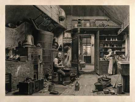 Fig 08. John Simmons and his apprentice working in the laboratory of John Bell’s pharmacy in Oxford Street. Engraving by J. G. Murray, 1842, after W. H. Hunt.