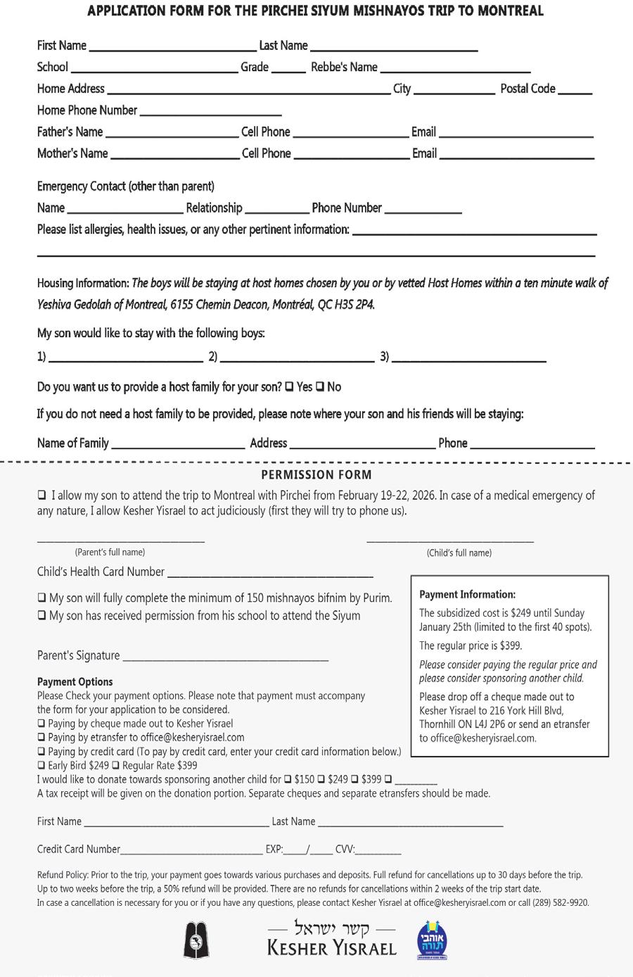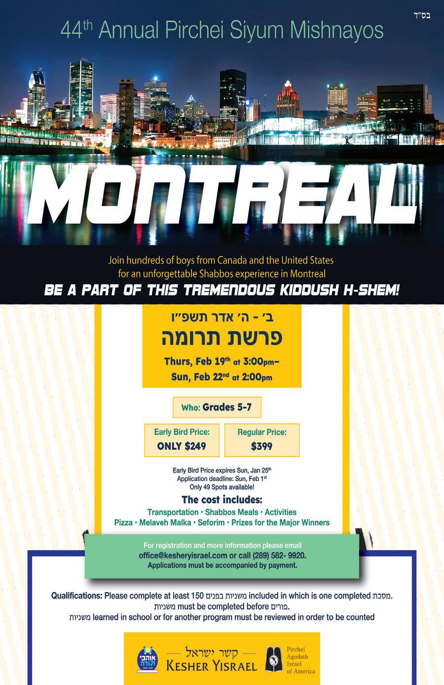 2:15pm Yeshivas Mishkan Hatorah 3452 Bathurst St. (opposite Grodzinskis) enter from rear entrance 416-800-9089 Maariv 9:00 pm winter, 9:30pm summer.