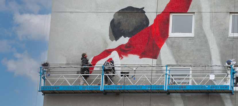 Jerome and a small team of helpers used the Pouncing technique that helps transfer work from paper on to a wall or other surface at a different scale. In this case it involved getting outlines of the main images i.e. the shape of the head in perspective, then working on detail once the proportions are correct.