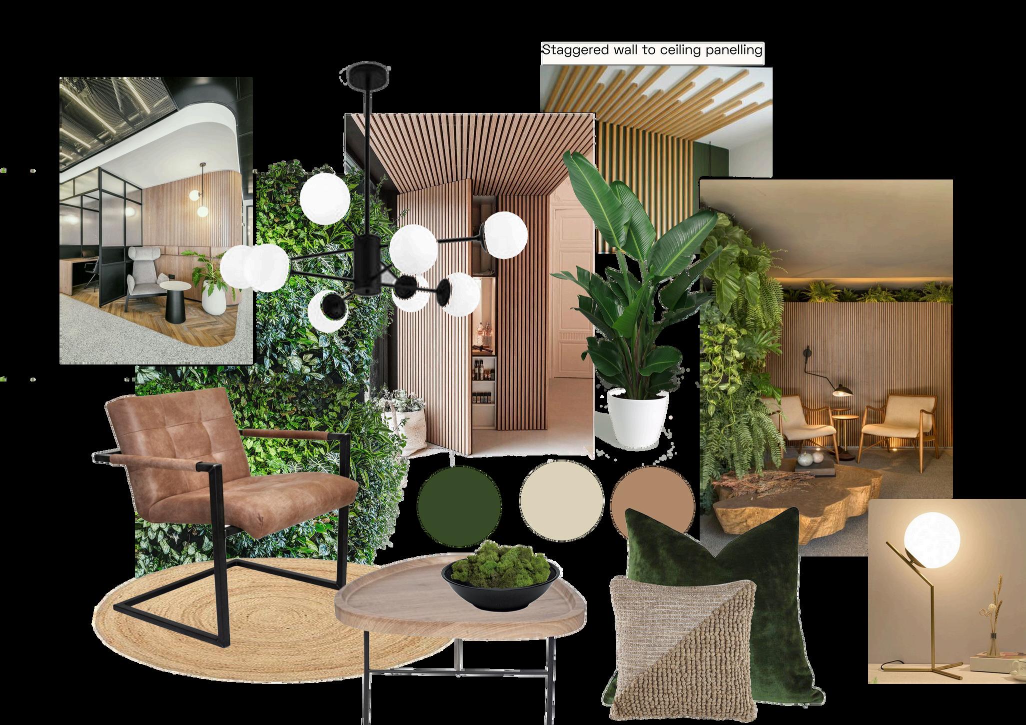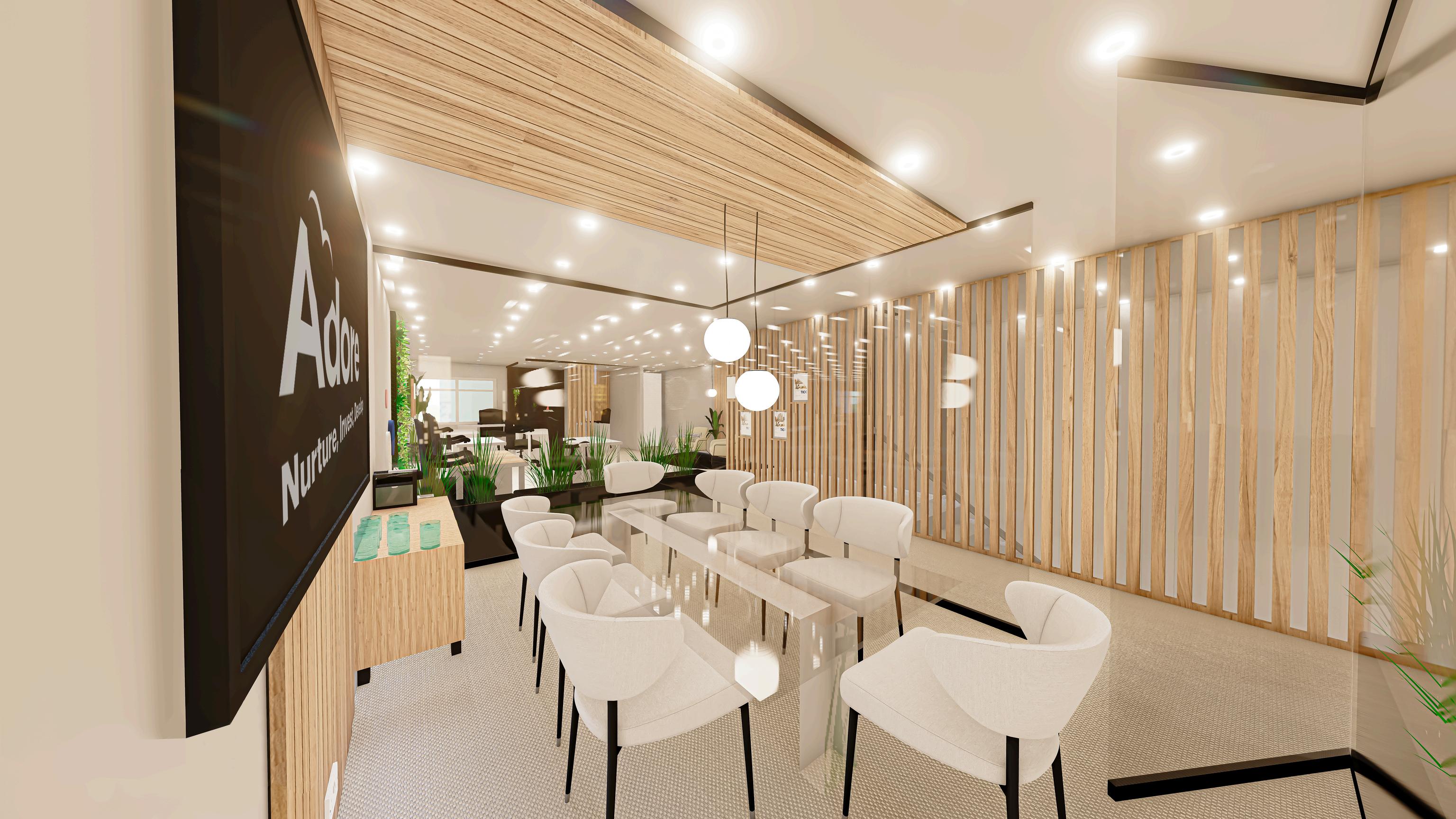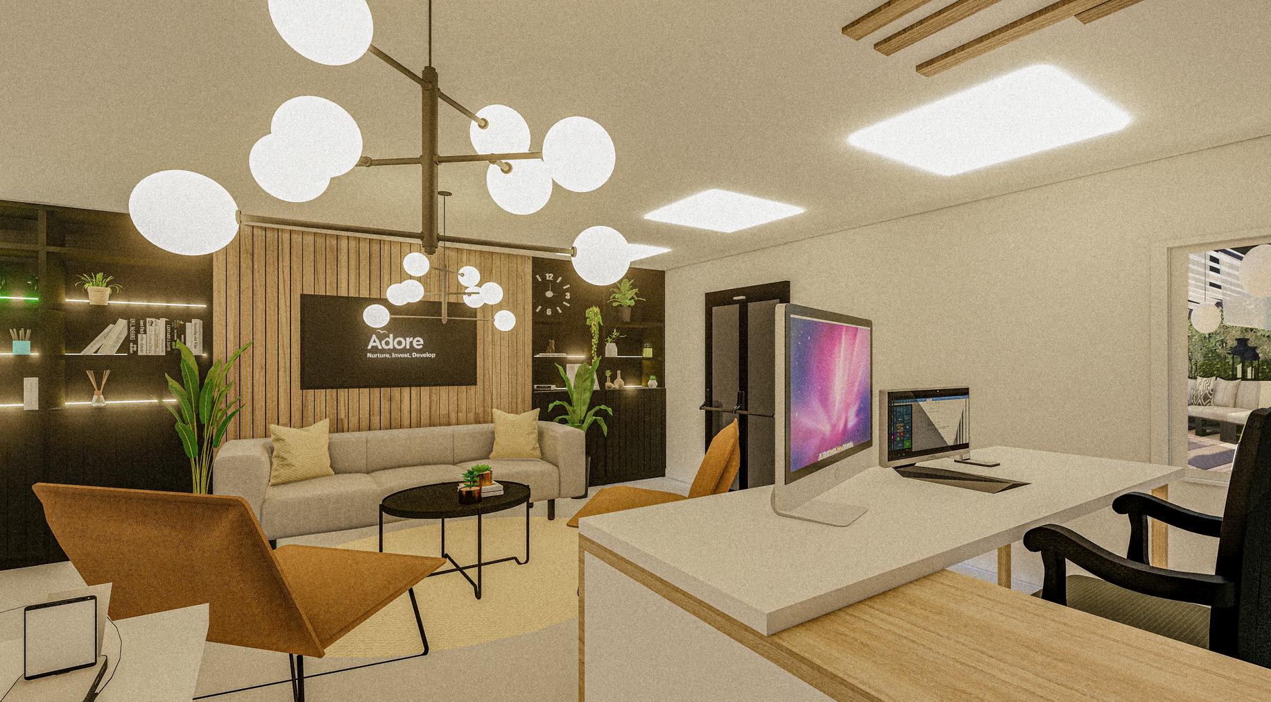The office redesign for Adore Group involved a comprehensive renovation of their city center office in two phases: indoor and outdoor The aim was to improve employee health and wellbeing through biophilic design strategies The indoor phase featured glazed office cubicles, a muted color palette with green accents, and the integrat on of plants and vegetation The outdoor phase focused on creating complementary, inviting spaces