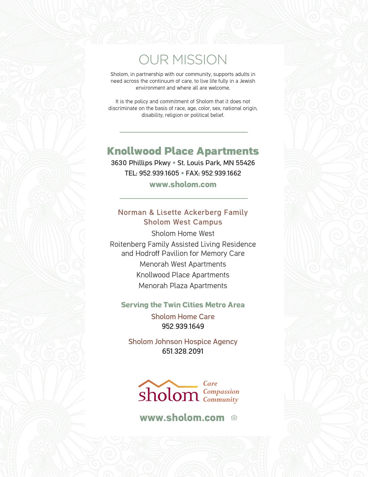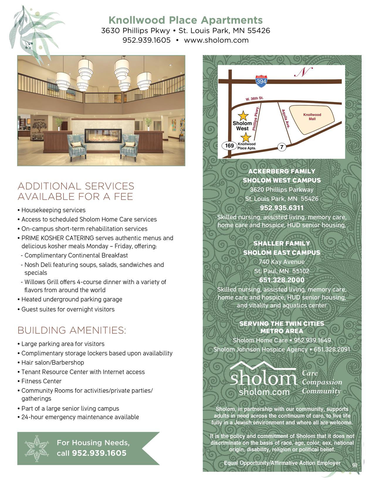 Located on the 17-acre Ackerberg Family Sholom West campus in St. Louis Park, Knollwood Place Apartments is part of a vibrant and welcoming community. Situated close to shopping, banking and recreational activities, Knollwood Place offers a distinct “neighborhood” feel. There’s always something to do or someone to visit with at “KPA.” A spacious outdoor patio with gazebo overlooks beautiful Lake L’Chaim behind Knollwood Place—an ideal spot for a leisurely walk. Convenient indoor walkways link all campus buildings together so friends and loved ones are just a few steps away!