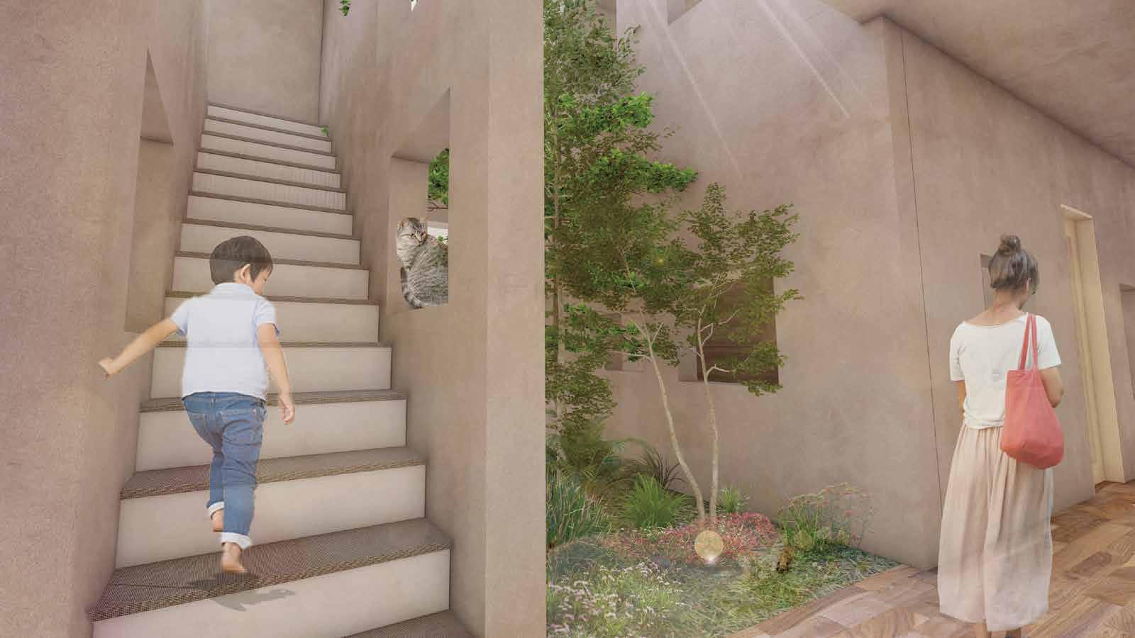 壁に穴を開ける。別空間に居ながら会話を生む。 緑を間に挟む。それぞれのプライバシーを守る。