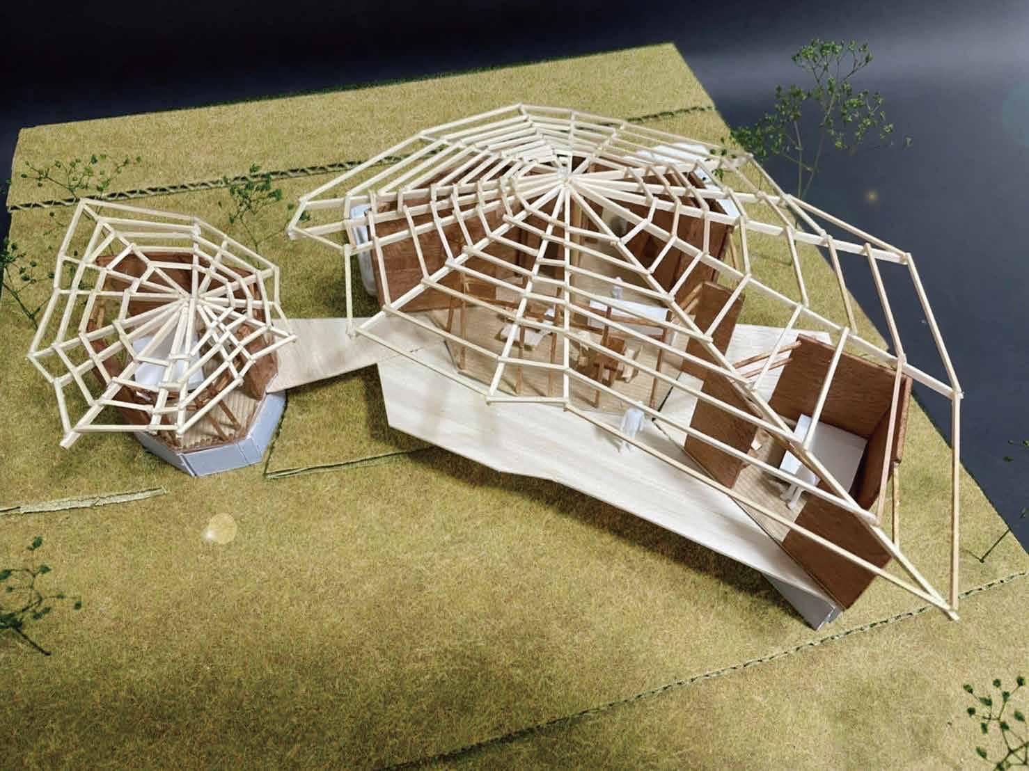 屋根は蜘蛛の巣のように敷地全体に放射状に広がる余地を持つ。