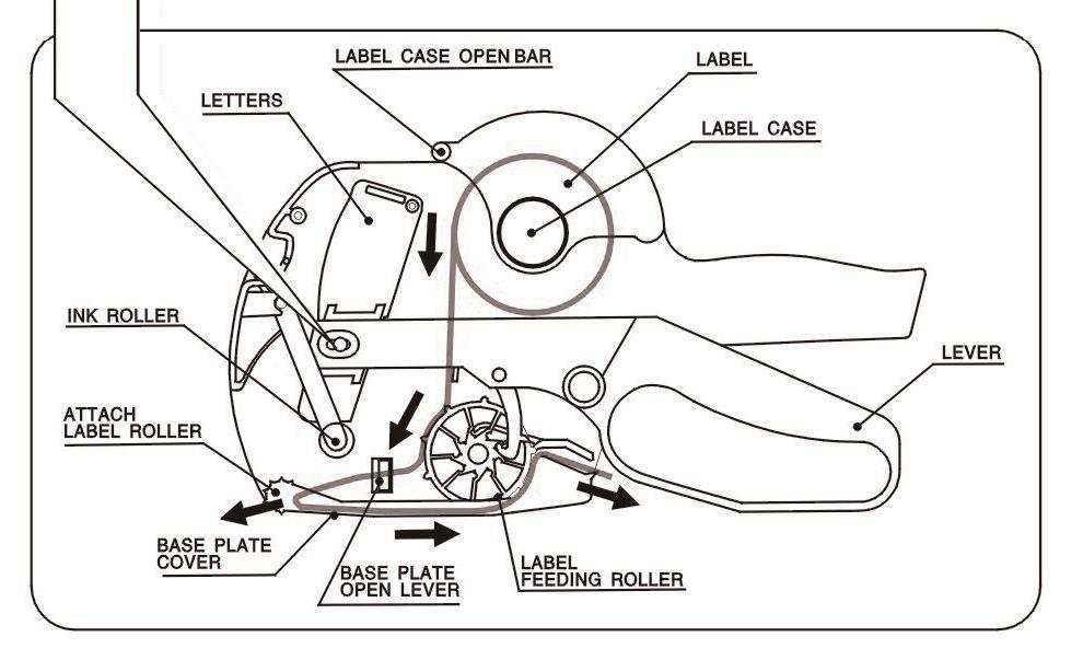 Squeeze and release lever three times for trial. Then the labels come out. Attach labels by sliding it into a desired place of product.