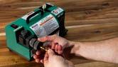 Features heavy-duty cast-iron construction, a reversible ram with magnetic tool holder, and rotating anvil.