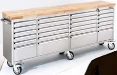 These tool cabinets are made from 430-grade stainless steel with a fingerprint-resistant finish. They each feature a durable 1½" thick rubberwood top, a flat-key central locking system, 6" casters, and 660 lbs. of load-bearing strength.
