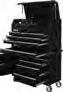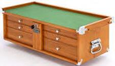 This handy tool cabinet features a folding table and eight felt-lined drawers to organize and protect your tools. Large locking casters and a chrome-plated push handle make it easy to move and secure in place. A locking bar with key keeps unwanted hands out and doubles as the support for the table. Use this cabinet on its own or combine it with a 23" stackable mid riser and tool chest for a complete mobile tool storage system that combines utility, beauty, and craftsmanship.