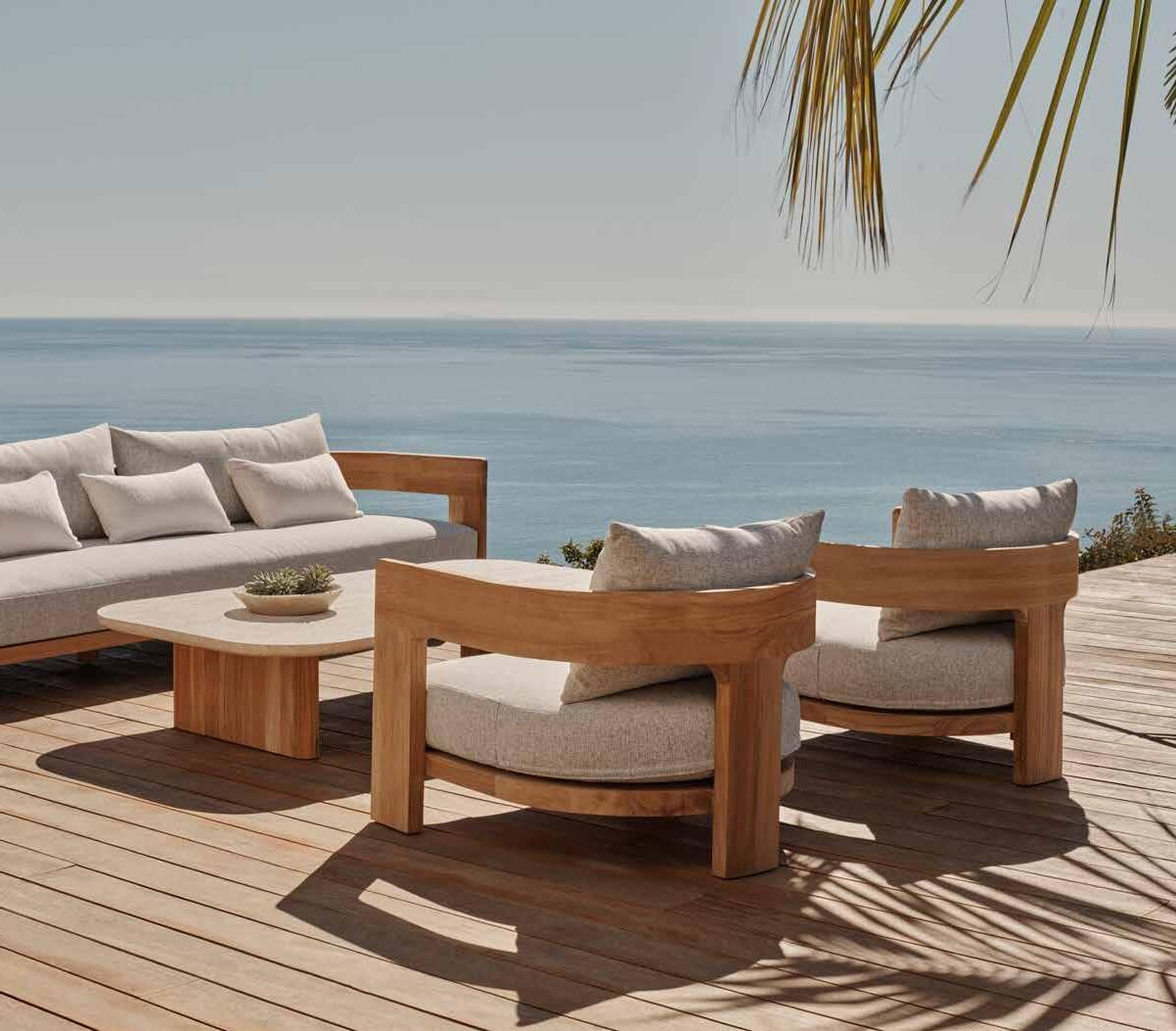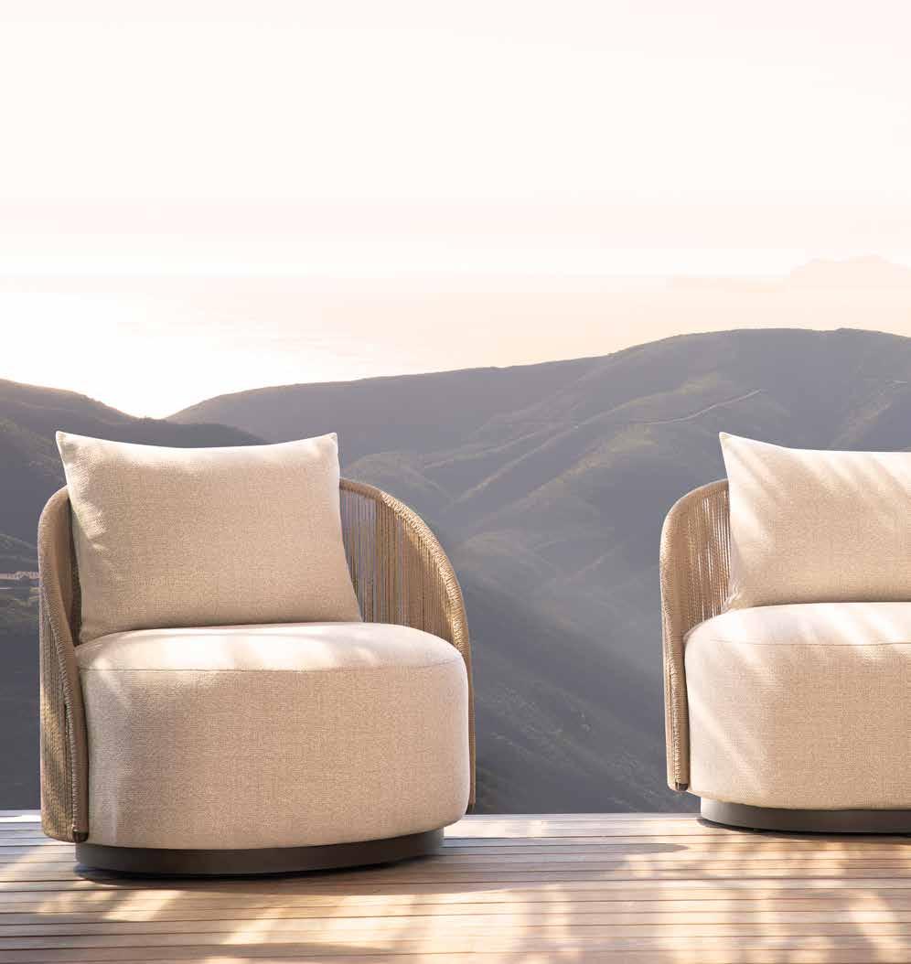 Organically-inspired signature curves and luxe outdoor upholstery showcase the traditions of fine Italian tailoring refined for a natural setting.