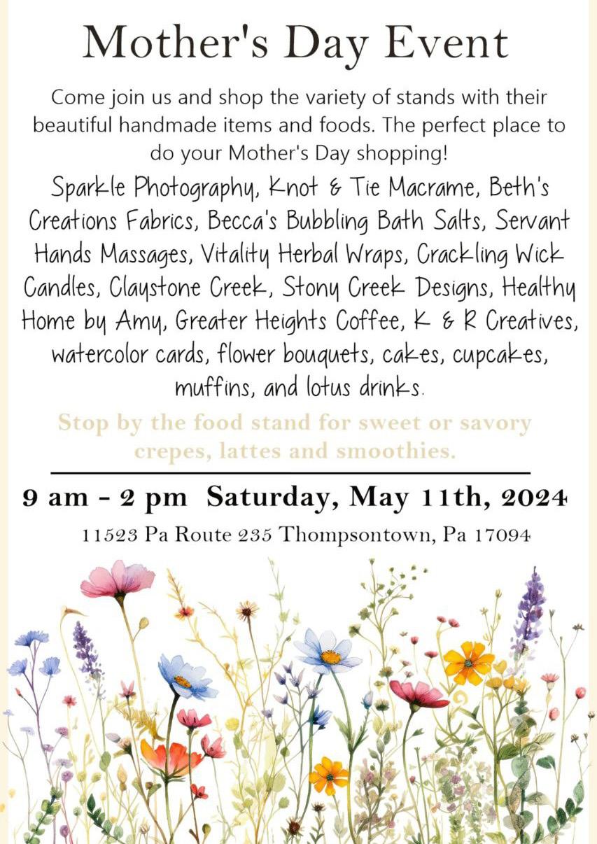 DAYMOTHER’SSAVINGS! May 4th - May 11th We carry brands like: ALFRED DUNNER - RUBY ROAD - SOUTHERN LADY - & more (Missy - Petite - Plus sizes) “Not Just for MenAnymore...CarryingWomen & Children Clothing” We fit them all Regular • BIG • TALL 2679 Industrial Park Road • Mifflintown, PA 17059 Hours: Mon-Fri 9am-7pm / Sat 9am-5pm Facebook.com/Mac’s Clothing We can help you find that special