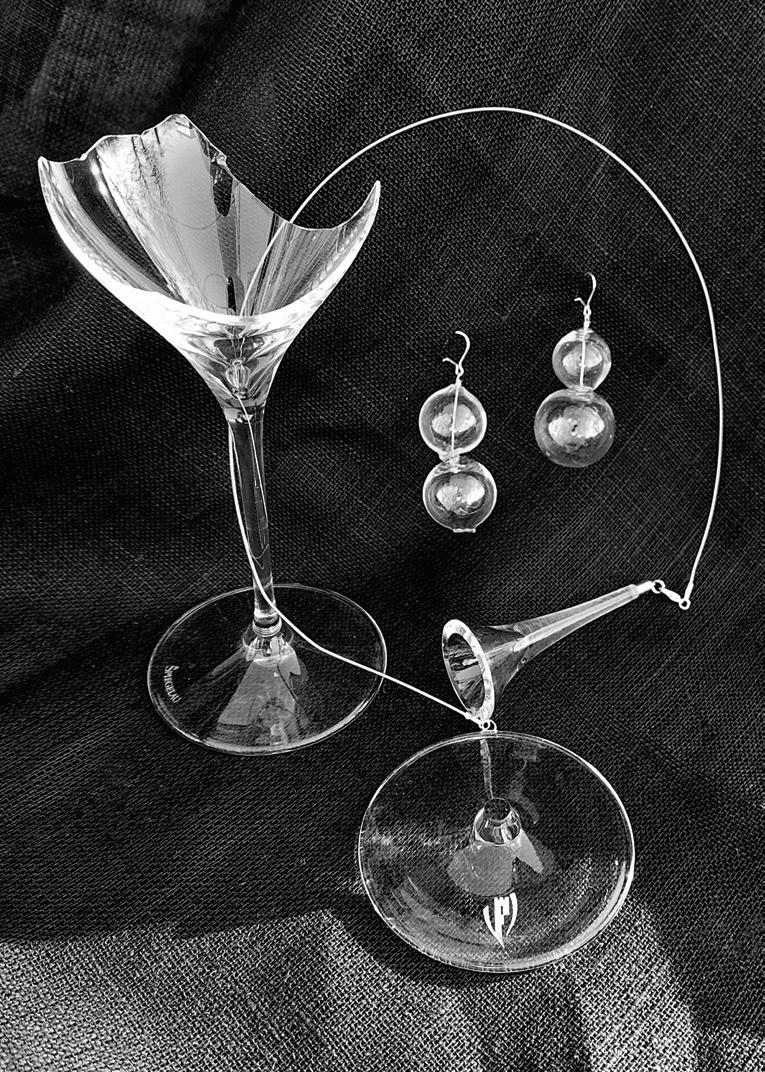 Glass production is energy intensive. “Afterparty” jewelry is made from recycled glass and guitar strings. The style of jewelry is guided by the nature of the original material. The label has information about the original products and, if possible, the era, – conveying and valuing history.