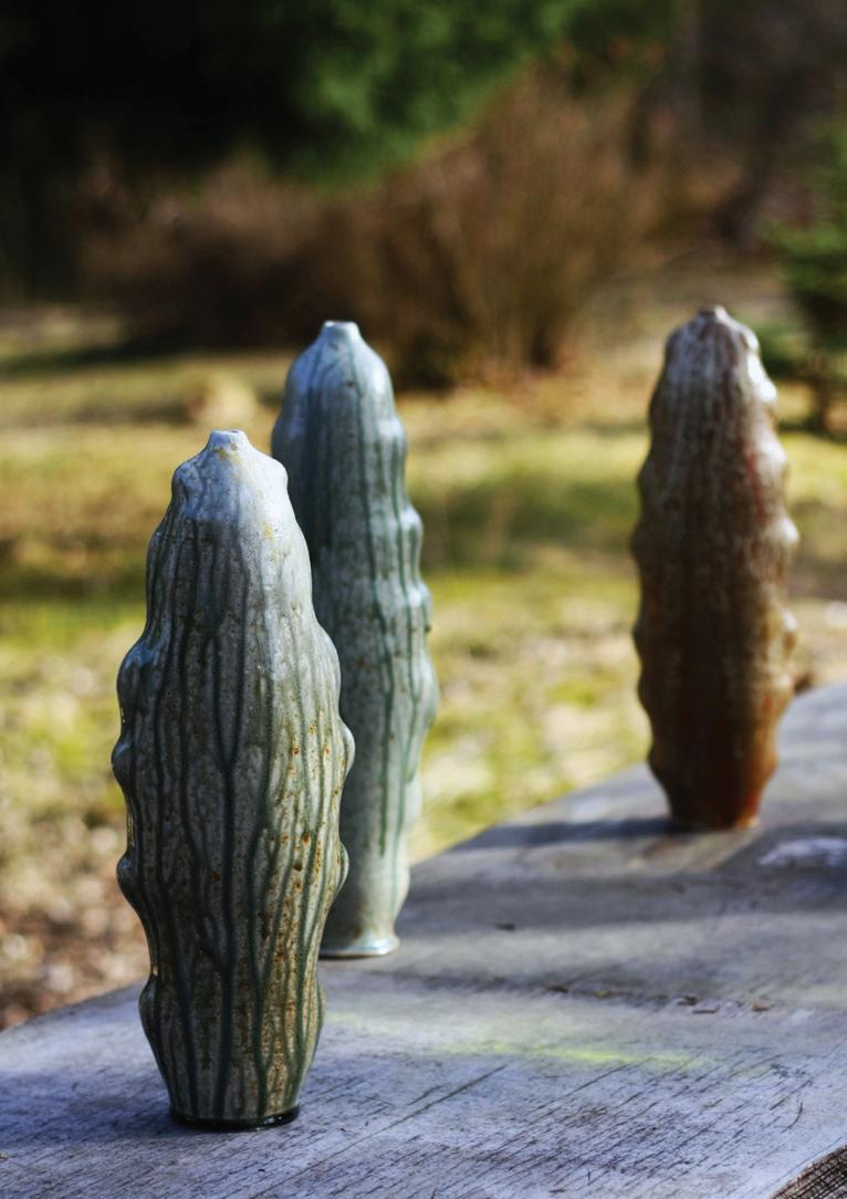 Crafted on the pottery wheel, the sculptural stoneware vases feature claybodies blending white and iron-bearing clays, often reclaimed from the artist’s studio work. The iron’s diverse presence creates dynamic effects in the wood-fired kiln’s reduction setting, complemented at times by local limonite for visual intrigue. The glaze incorporates 60% ash from residential wood-burning ovens, with firing temperatures soaring to 2345 F (1340 C, cone 12). Sustainable kiln design includes preheating external combustion air, enhancing efficiency and reducing wood consumption. Wood fuel is predominantly reclaimed from a nearby lumber supplier, underscoring the artist’s eco-conscious approach to their craft. These practices not only yield unique vases but also reflect a commitment to environmentally friendly production methods.