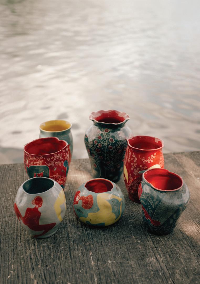 Liisu’s handcrafted work is traditional; there have been basically no changes in the last 10,000 years. An item is crafted out of clay, goes through bisque firing and then glaze firing and in Liisu’s case into a third firing where gold is added.