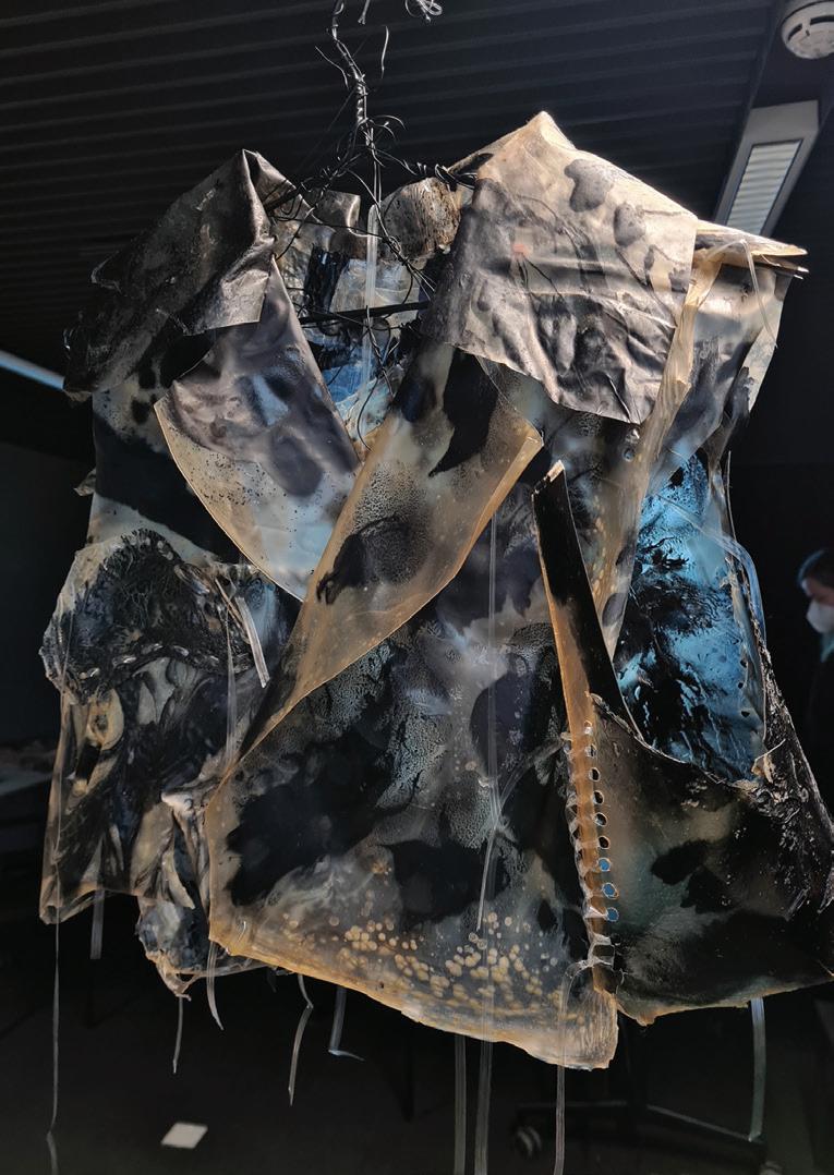 Riina O is exploring how Symbiotic Culture of Bacteria and Yeast (SCOBY) leftovers generated from the kombucha drink industry can be re-processed into a new, regenerative, vegan, leather-like material called SCOBY-compo and intricately crafted into a collection of handbags “Crafting Organic Waste For Fashion”.