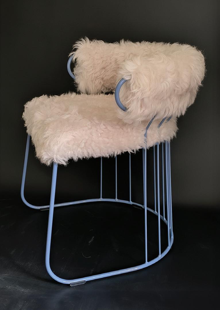 “Vurle” Elbow Chair by Elmet Treier, is a versatile piece perfect for dining tables at home, cafes, or restaurants. The designer drew inspiration from the thick Estonian sheepskin, a challenging material that often goes to waste. As a vegetarian, Treier values all life forms and believes in utilizing every part of an animal that has nourished a human, out of respect for the creature. The chair embodies this ethos of respect. Crafted from metal and authentic Estonian sheepskin, the “Vurle” Elbow Chair combines functionality with sustainability, offering a unique and ethical seating option for various settings.