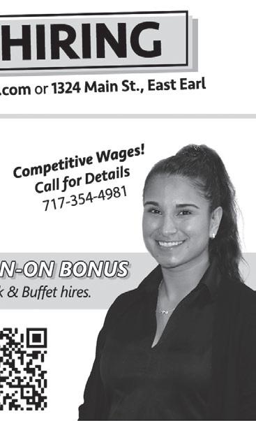Now Under New Ownership • Comprehensive Hearing Evaluations • Hearing Aids - All Makes & Models • Easy Access and Parking www.cocalicohearing.com Dr. Kamal Elliot, Au.D. and Dr. Bethany Weaver, Au.D. Most Insurances Accepted Open Monday thru Thursday by appointment (717) 336-8198 • 3 Cardinal Drive, Stevens, PA 17578 Come And Experience e Quick, Friendly, E cient Service For Lunch Grilled Chicken Avocado Salad Grilled Chicken Berry Almond Salad Strawberry Salad • Greek Salad Buffalo Chicken Salad • California Chicken Cobb Salad Home Style Fresh Burgers • Over 10 Choices of Grilled Paninis Triple Decker Club • Sandwiches • Homemade Soups Homemade Daily Specials • Fresh Wraps Hot Panini Sandwiches • Cheeseburger • Cheesesteak • Chicken Tips • MANY MORE CHOICES! 3687 Rothsville Rd., Ephrata (717) 738-7381 Mon.-Sun. 6am-8:30pm 1050 W. Main St., Mount Joy (717) 653-2140 Sun.-Thurs. 6am-8pm • Fri. & Sat. 6am-9pm TOTAL BREAKFAST CHECK GUS’S KEYSTONE FAMILY RESTAURANT With coupon. Mon.-Thurs., 6am-11am ONLY Not valid on holidays, with any other offers or specials. Exp. 2/8/23. Buy 1 LUNCH or DINNER Entrée & Get the 2nd Entrée for 25% OFF GUS’S KEYSTONE FAMILY RESTAURANT With coupon. Mon.-Thurs., 11-8:30pm (Ephrata), 11-8pm (Mount Joy) ONLY. Not valid on holidays, with any other offers or specials. Exp. 2/8/23. Serving Breakfast All Day Takeout Available Check Our Website For Coupons • www.guskeystone.com Featuring Broasted Chicken 15% OFF 25% OFF Prepare for power outages today WITH A HOME STANDBY GENERATOR *To qualify, consumers must request a quote, purchase, install and activate the generator with a participating dealer. Call for a full list of terms and conditions. REQUEST A FREE QUOTE CALL NOW BEFORE THE NEXT POWER OUTAGE (866) 643-0438 $0 MONEY DOWN + LOW MONTHLY PAYMENT OPTIONS Contact a Generac dealer for full terms and conditions FREE 7-Year Extended Warranty* A $695 Value! 9 9 9 717-723-7580 www.lititzmetalroofing.com eli.smucker95@gmail.com 823 Disston View Drive, Lititz, PA 17543 PA License #166057 Metal & Shingle Roofing Experts. Put your trust in the experienced team at Lititz Home Improvements LLC when it comes to all your metal and asphalt shingle roofing needs. We will turn your existing home into your dream home! Areas we serve include: • Chester County • Lancaster County • Montgomery County • Delaware County • Bucks County • Philadelphia Court Amish Roofers Serving Chester County, PA The Amish roofers at Lititz Home Improvements are experts in metal and asphalt shingle roofing. When it comes to roof installation and repairs, our Amish roofing company can take care of everything from start to finish – from the initial inspection to the final cleanup. We are proud to offer top-rated brands for all our roofing services like GAF, so you can trust that your new roof will be built to last. No project is too big or too small for our team to handle. If you need a new roof for your home, contact our metal roofing contractors today for a FREE quote! Decks • Bathroom & Kitchen Remodeling • Flooring Installaon • Replacement Windows & Doors No Job Too Small • Free Esmates Hartings Park Remodeling, LLC Bryan Minnich Ken Leibig 717.682.6552 717 383.1577
