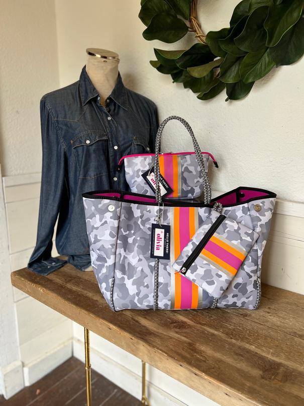 The TAYLOR GRAY neoprene carryalls have so many possibilities. They are perfect for travel, makeup, accessories, school supplies, toiletries, business items, lunch or snacks...you name it! Our carryalls come complete with a zipper closure, internal mesh pocket along with snaps on the sides