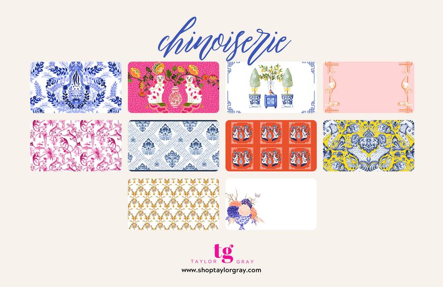 Chinoiserie Toile Chintz whatever you call it, it is POPULAR! This set is a playful collection of color, pattern and animals in the popular Chinoiserie motif It is a great way to incorporate the patterns in a home without having to fully commit