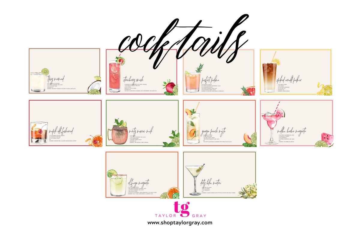 Cocktails for everyone! We are in love with these hand-drawn watercolor cocktail inserts The detail is incredible, and the addition of the recipes is perfect for any bar cart Featuring Spring & Summer cocktail recipes along with garnishes