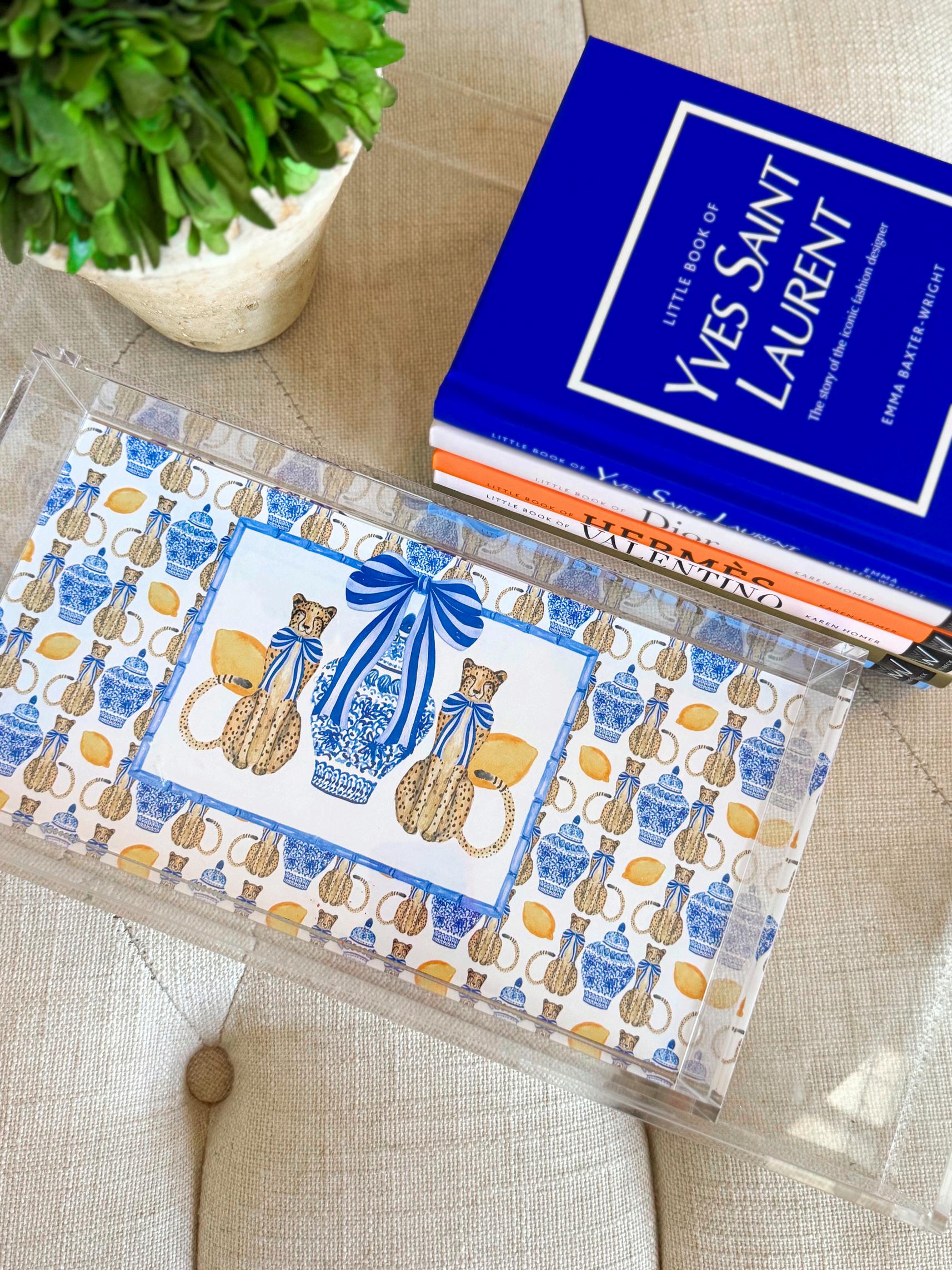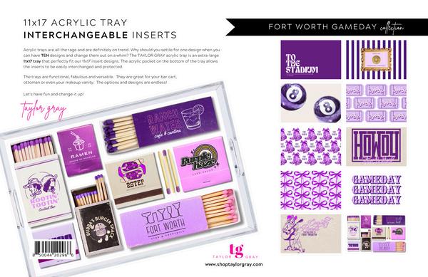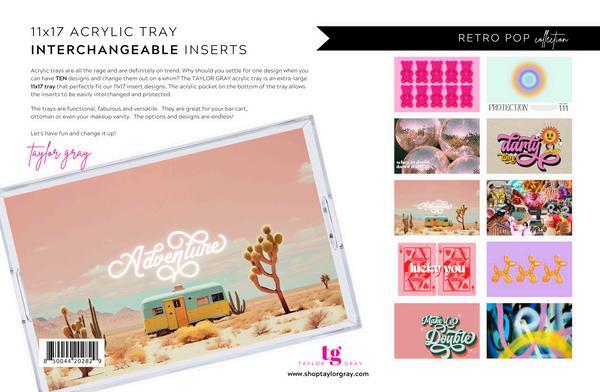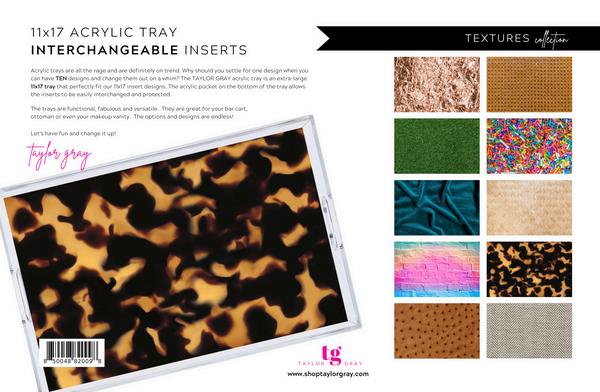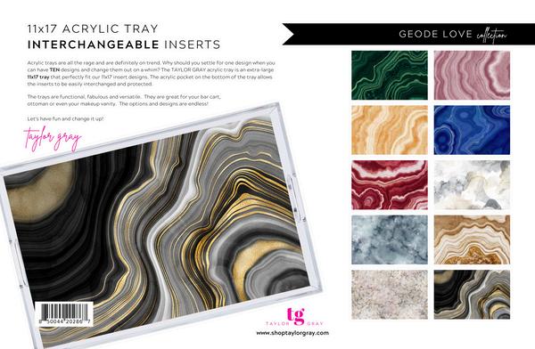 The TAYLOR GRAY acrylic tray is an extra-large 11x17 tray that perfectly fit our 11x17 insert designs. The patent pending pocket on the bottom of the tray allows the inserts to be easily interchanged and protected. The trays are functional, fabulous and extra-large. They are great for your bar cart, ottoman or even for makeup on your vanity. The options and designs are endless!