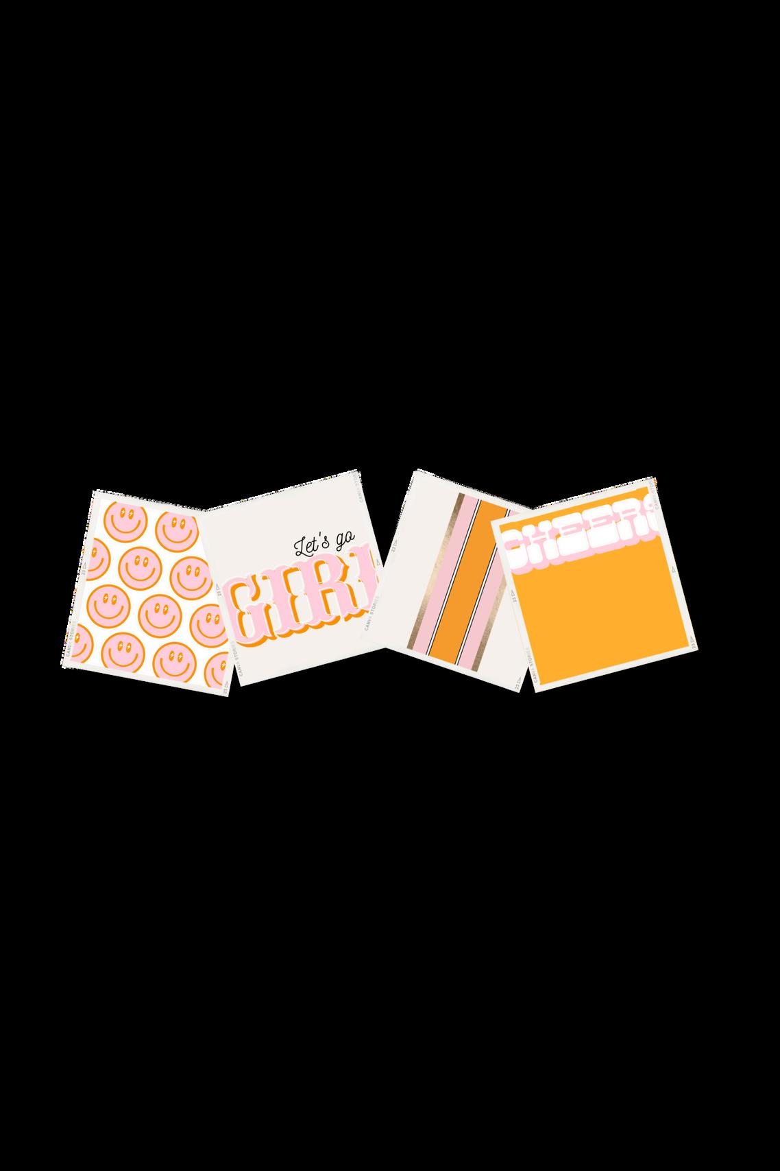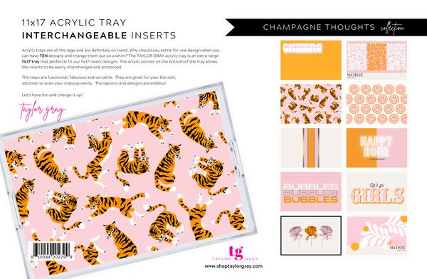 Champagne Thoughts is our nod to the Veuve Clicquot champagne trend. The colors are spot on and add that perfect pop of orange and pink for your bar cart. Swap from Matisse inspired inserts to playful tigers to BUBBLES, BUBBLES, BLUBBLES!