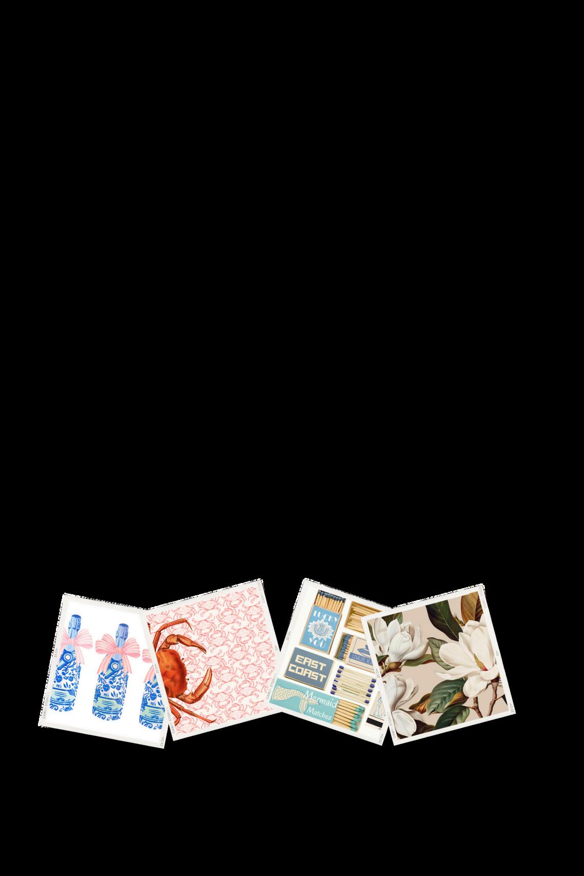 Oui Oui! The timeless French pattern, toile, is the perfect pinch of sophistication for any home. The insert set is a great addition to any bar cart, ottoman or etagere. The Totally Toile insert set includes bright reds, traditional blues and a variety of floral, Hollywood and equestrian patterns.