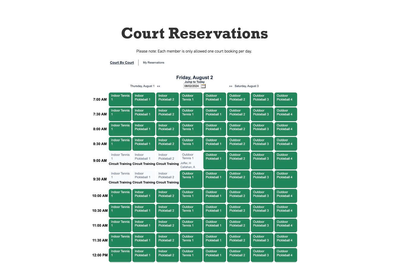From your desktop computer, log into the Member Portal and go to 'Member Life' in the navigation bar. Then, click on 'Court Reservations,' and you'll find eight columns—one for each indoor and outdoor court. A court can be reserved by selecting a date in the calendar or book a same-day reservation up to an hour in advance.
