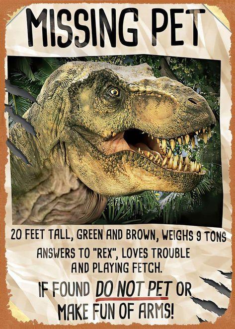 • MISSING PET – 20 feet tall, 9 tons, answers to “Rex”, loves trouble and playing fetch, if found, DO NOT PET or make fun of his arms!