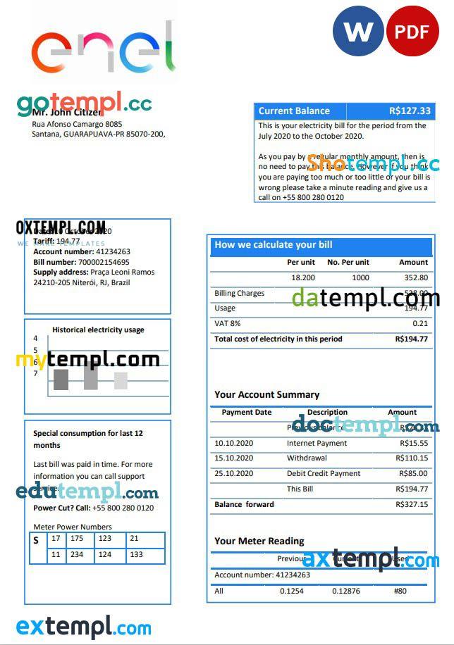 Completely editable Brazil ENEL electricity utility bill of high quality, which may be used as a proof of address in many sites.