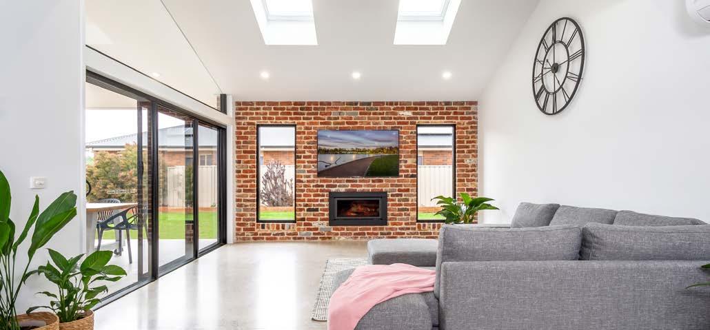 The desired style was industrial but maintain a homely feel. To achieve this, Smith & Sons Shepparton incorporated recycled brick walls, skylights, gas log fire, large stacker doors, custom-made barn doors and feature raked window.