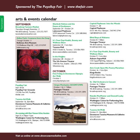 Capital Playhouse: Into the Woods October 7 - 30 Capital Playhouse 612 E 4th Ave, Olympia | 360.943.2744 capitalplayhouse.com Blind Boys of Alabama October 8, 7:30pm Pantages Theater 9th & Broadway, Tacoma | 253.591.5894 broadwaycenter.org It’s Your Day-Health, Beauty and Wellness Show October 9, 11am-4pm Auburn SuperMall 1101 SuperMall Way, Auburn | 253.826.9001 showcasemedialive.com/events Arts Crush Open Mic Poetry Marathon October 16, 11am-5pm Kings Books 218 St Helen’s Ave, Tacoma kingsbookstore.com St. Olaf Orchestra in Concert October 16, 7:30pm Pantages Theater 9th & Broadway, Tacoma | 253.591.5894 broadwaycenter.org Natalie MacMaster and Donnell Leahy October 21, 7:30pm Washington Center for Performing Arts 512 Washington St SE, Olympia | 360.753.8586 washingtoncenter.org Tacoma ArtWalk October 21, 5pm-8pm Downtown Tacoma Museums & Galleries 253.272.4327 artwalktacoma.com