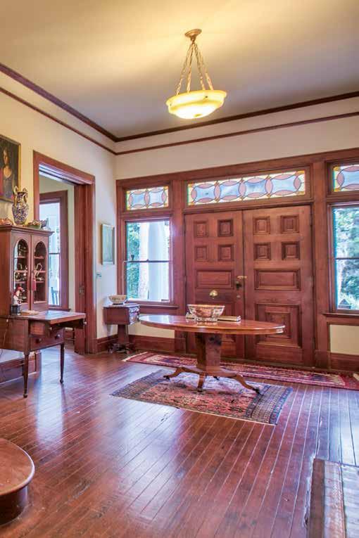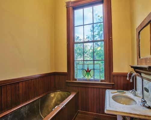 The interior has 13 foot ceilings on the first floor and twelve foot ceilings on the second floor, crown and picture moldings, five sets of double pocket doors, eight corner fireplaces with original mantles, fireplaces in the entrance hall and kitchen, a built-in curly pine mirrored sideboard in the dining room, two full height walk-out windows, and full transoms over all hinged doors. There are working speaking tubes from several areas of the house to the kitchen, and an original bathroom on the second floor contains all of its original fixtures including the toilet, sink and zinc covered copper bathtub.