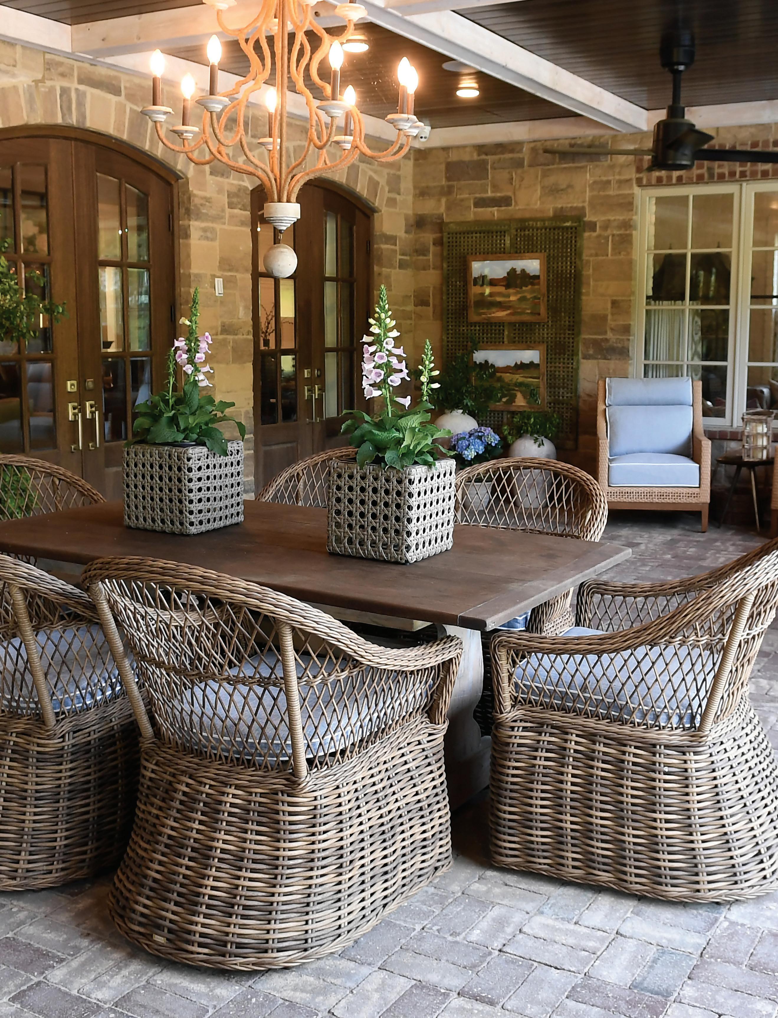 The covered back porch of Ken and Dawn Morrison’s elegant stone home in the country. Photo by Wes Sewell Photography. 52
