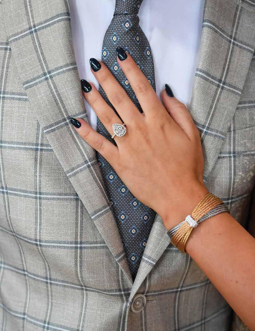 For your next special occasion, show off your beautiful accessories like this Alor two-toned bracelet with diamond accent along with a pearshaped statement ring that would make anyone look twice, both from Steel’s Jewelry. While you sparkle, the man in your life will be confident with you on his arm because he will be wearing a fine silk necktie and sports coat from R. L. Martin & Co.