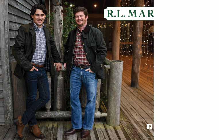 Dane Boruff is styled in an olive Beaufort jacket by Barbour, with a plaid sports shirt shirt by Southern Point, and denim by Citizens of Humanity. To complete the look he is wearing genuine leather Frye boots. His fiance’, Brooke Robinson also loves throwing her Barbour jacket over a best selling sweater by Kerisma and riding boots by Frye.