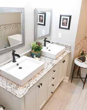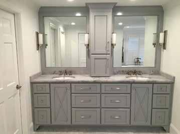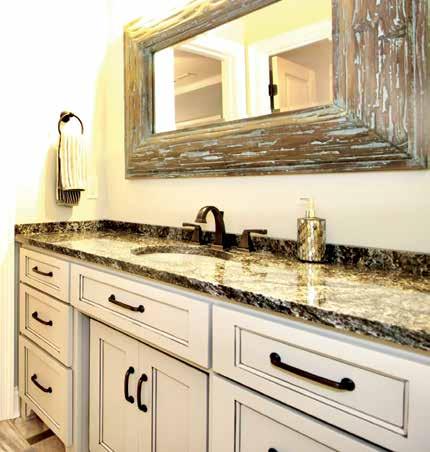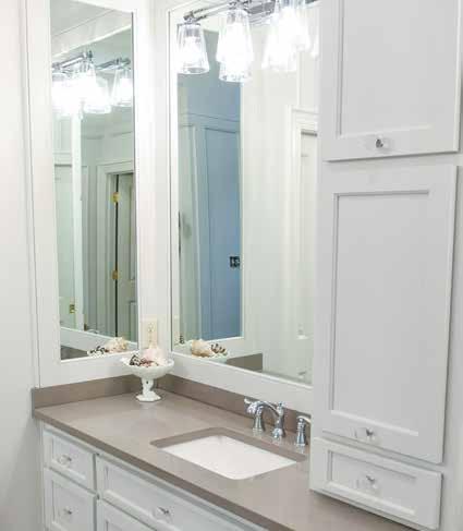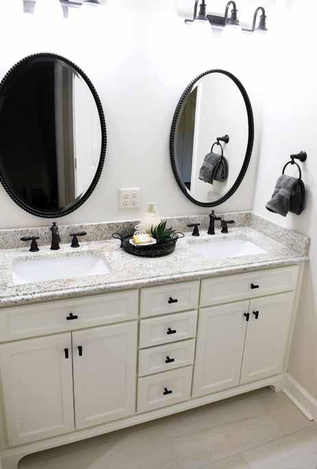 The master bathroom has double vanities with inset, paneled mirrors and plenty of storage. A pocket door leads to the bedroom. Mirrors by Clinch County Glass. Countertop by Paramount Granite. Lighting by Lighting Concepts.