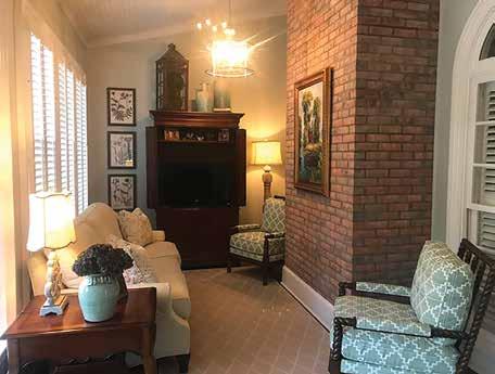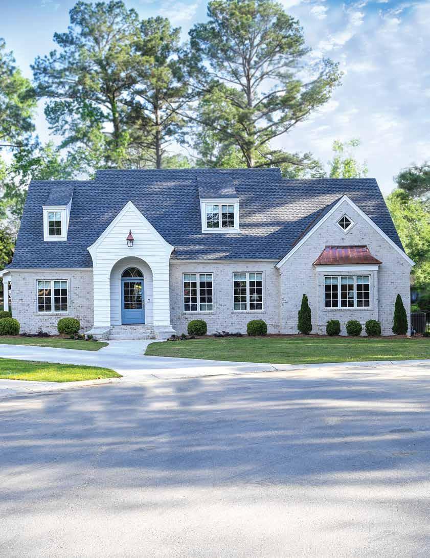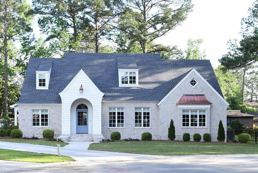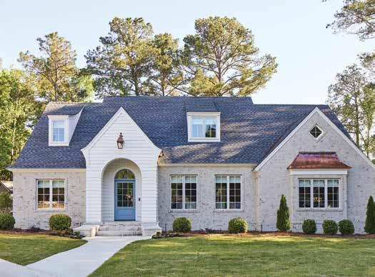 that the couple developed with the purpose of locating their new home. The arched porch design provides an elegant focal point and includes a custom door – painted a pleasing blue--a flickeringgas copper lantern, richly detailed siding and corbel details all surrounded by lime-wash finished brick and a copper bay roof. These elements all combine to instantly add a sense of history and character to the home. And, the home offers a variety of unique interior and exterior places and private spaces for family and friends to gather including a sunroom just off the kitchen, an upstairs den and music room, and a covered outdoor living space complete with a dining table and fireplace overlooking the pool.