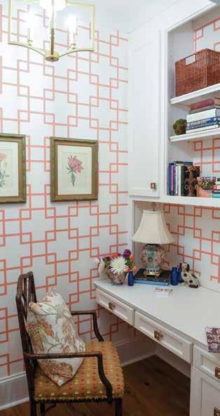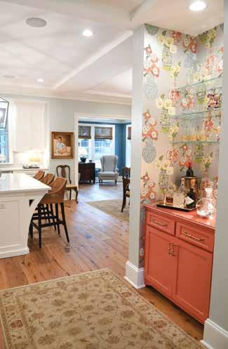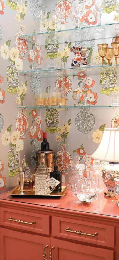 Connecting the living room to the kitchen and dining areas is a dry bar with coral-painted cabinetry, richly-patterned wallpaper (sourced by Mizell Interiors), and glass shelves (supplied by Clinch County Glass). It becomes the center point of color and focus as you enter the home.
