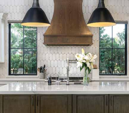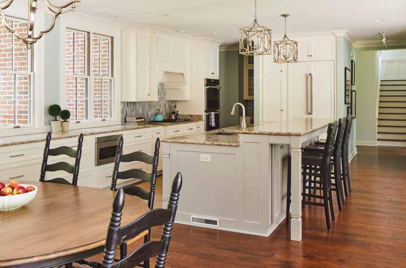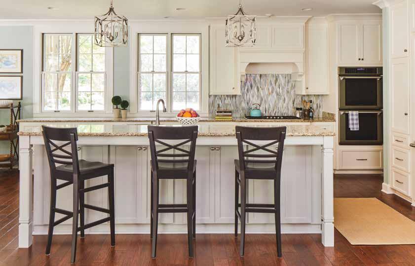 The island kitchen is full of details and patterns that provide a rich backdrop and texture for the space where everybody gathers. The arches on the island match the arches on the exterior. The lights above the island were purchased from Lighting Concepts and then hand-painted. The counter, by Paramount Granite, is quartz. The bar stools were sourced through Mizell Interiors.