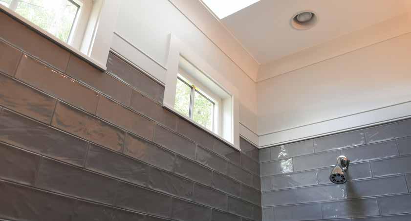 A skylight and windows in the master shower allow natural light to bounce off the textured grey tiles. Tiles by Weidinger.
