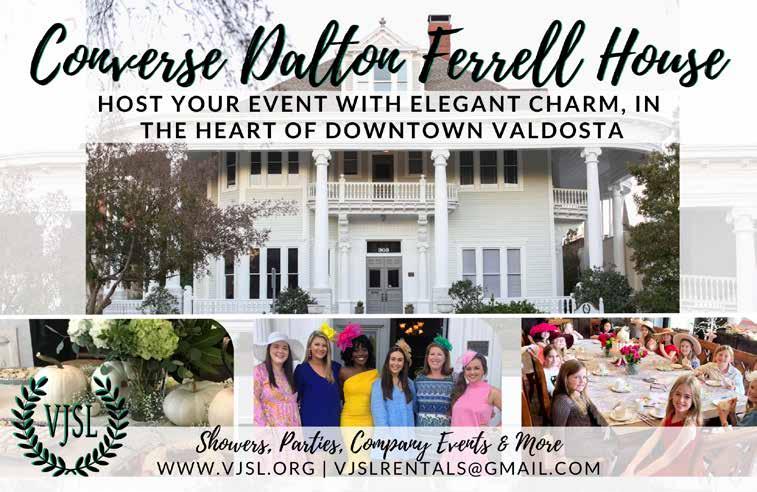 Valdosta Magazine is published quarterly by SHOWCASE PUBLICATIONS, INC. For information on advertising, submitting articles, or to subscribe: (912)-559-2045 – P.O. Box 391 Jesup, GA 31598 info@showcasepublicationsga.com Subscription rates in the U.S. are $15.00 annually. showcasepublicationsga.com @valdostamagazine All rights reserved. Copies or reproduction of this publication in whole or in part is strictly prohibited without expressed written authorization from the publisher. Every e ort is made to ensure the accuracy of the information contained herein. Advertising is subject to omission, errors and other changes without notice. The opinions expressed by the writers are not necessarily those of the publisher.