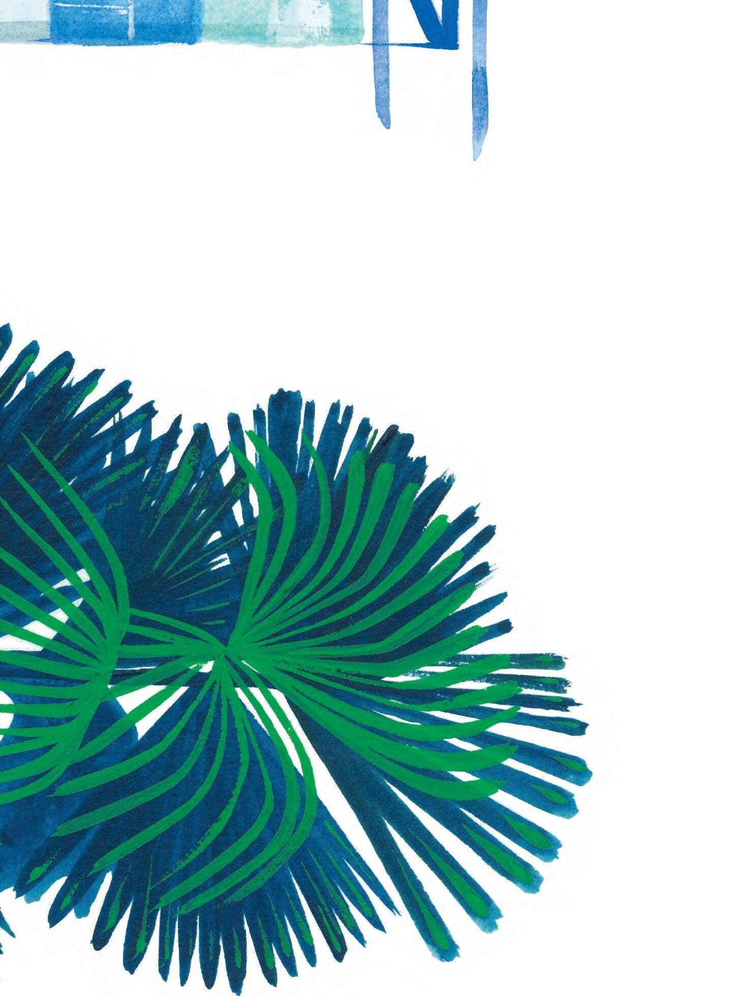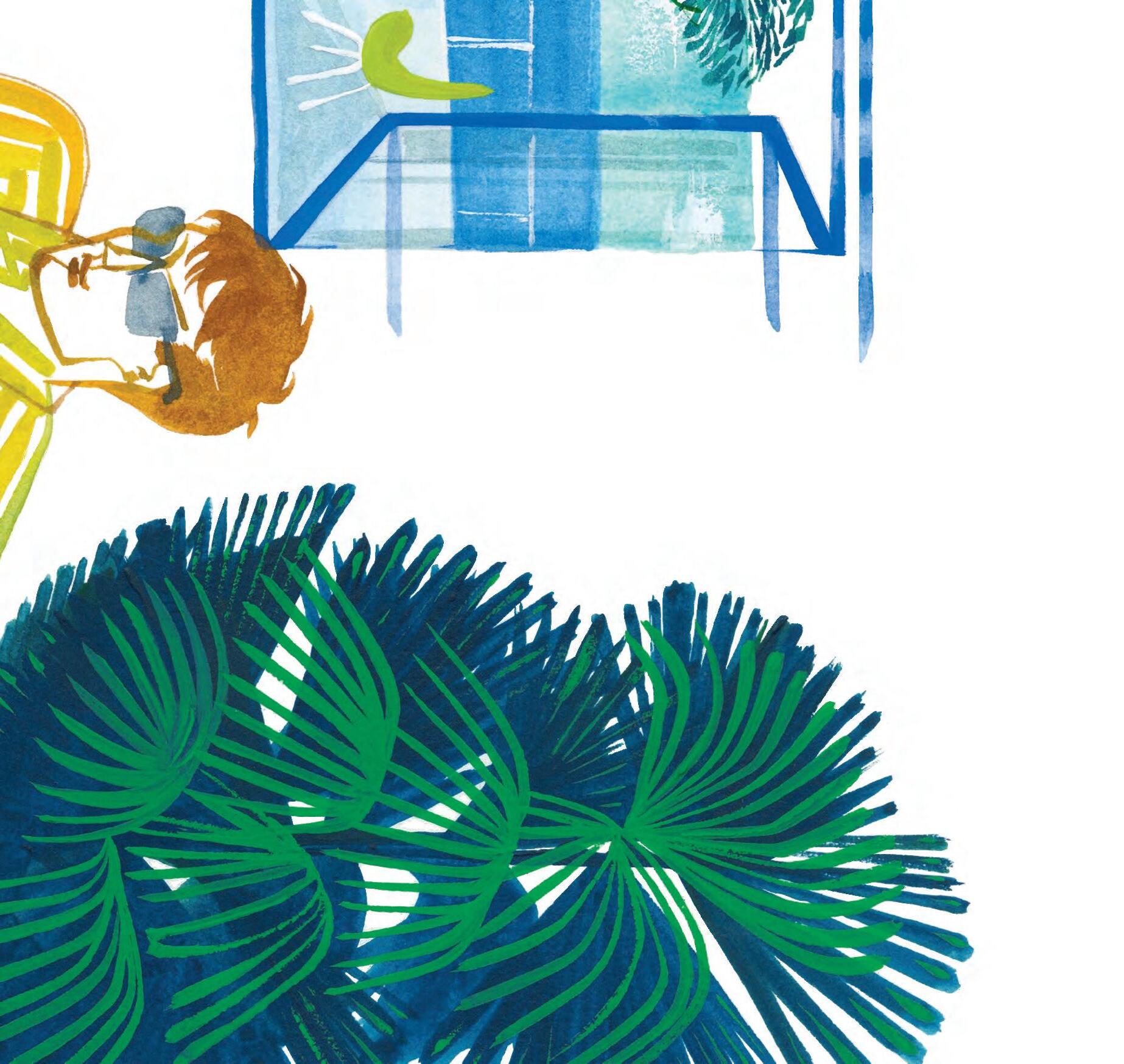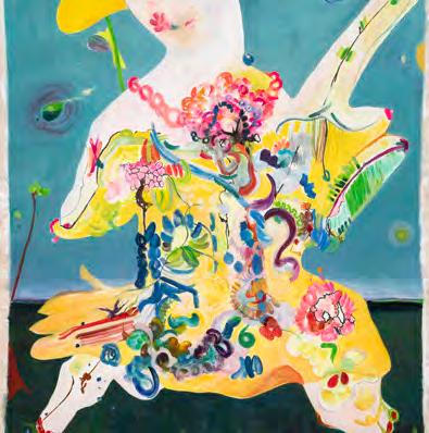 HEATHER BUCHANANreflected in her beautifully vibrant works, done in water-based oils or washes and watercolors where she mixes her own colors. Even her paint palette is a work of art. “Nature definitely affects me,” she says “When I was in my LA house you could see the ocean and blue was predominant in my work. Now I am going into very different colors.” Luckily, she inherited her vibrant garden in Southampton from the previous owner as she admits with a smile, “I came from an environment of cacti to this.”