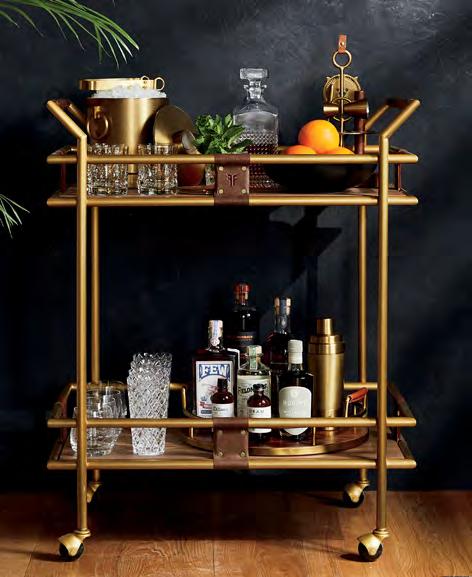 Frye two-tier bar cart shows off spirits, sparkling glassware, and bar accessories. The brass plated cart is finished in antiqued gold. $699 crateandbarrel.com