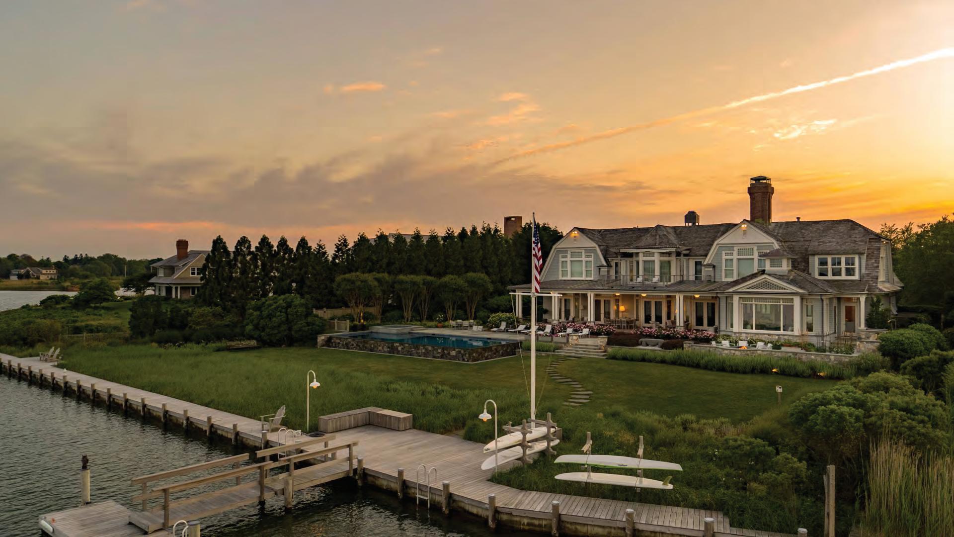 Enjoy panoramic stunning waterfront views from this classic Hamptons shingle style home quietly listed and available for the discerning buyer who understands the value of purchasing a turn key house in near perfect condition. ith most rooms bathed in light and spilling out to the wide waterside terrace, the , F foorplan offers rooms for entertaining and enjoying family and friends during all four seasons. Six bedrooms in the main house including a primary suite of over 1,200 SF. Interior features include, waterside dining room with hydraulic walls of glass, large rooms for entertaining, several freplaces, a fantastic indoor and separate outdoor kitchen, two private offces, billiards room, temperature controlled wine room, gym with ad oining bath. Private balconies and decks, secret gardens and terraces soak in sun and the sea air for your quiet enjoyment. Exterior features on this fully landscaped parcel include 220’ of bulkheaded frontage with dock, a water side pool with adjacent sunken spa, outdoor shower, frepit. eparate one bedroom guest house two car garages all hidden from public view behind security gates and established landscaping. Co-Exclusive Offering. $38,950,000 WEB# 901533