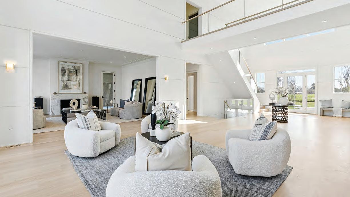 Sagaponack. With a new attractive price and elements of scale and architecture that could not be reproduced in this location today, a beautifully landscaped acre on Crestview ane along of Fairfeld Pond plays host to a magnifcent , F, bedroom modern estate recently completed near the ocean in agaponack. asterfully scripted by rian O eefe, the architect employed fundamental principles of balance, proportion, function, and beauty to synthesi e classical design principles with a contemporary aesthetic. harles llem, principal of . . nternational, was engaged as esign irector and nterior esigner with overall pro ect oversight. is vision for this property was to create an e perience driven by his client s lifestyle. e established a color palette of taupe and beige punctuated by black. harles embraced the use of natural honed materials as in bronze, stone, and leather. Complimented by hand woven linen textiles to achieve a casual sophisticated look and cohesive experience, he was able to achieve a restrained, sophisticated, and balanced residence that was both meticulously curated and eminently livable. Indeed, the drama gradually unfolds as you walk past the marble waterfall wall and through a marine grade stainless steel sliding door into a , F contemporary sanctuary of wood and stone that reveals the e pansive living room warmed by a freplace. The modern Poliform designed kitchen anchors the center of the residence that fows to both the sumptuous freplaced family room as well as the formal dining room augmented by a butler s pantry. bedroom suite overlooking both pool and pond completes this frst foor. pstairs the serene and privately sited master wing, with both pond and ocean views, offers lu urious ony clad bath and dual closets. continuous walkway, acting in the words of O eefe, as a brise soleil , connects additional bedrooms suites. limbing from outside the second foor offce, a staircase fnds the , F roof deck, an amenity no longer permitted in this tony hamlet, offering bar, multiple seating areas and incredible views out to the tlantic and neighboring farm felds. n elevator descends to the , F lower level which includes screening room, recreational area, billiard room with bar, wine cellar, 2 staff suites and an entire wellness center with gym and spa that includes steam, sauna, hot tub. cold plunge and massage room. A spacious covered loggia provides for outdoor dining and the main level Foussena Grigia stone slab fooring e tends out in all directions blurring the line between indoor and outdoor. nd in fact, this covered patio with e tensive built in kitchen and comfortable seating overlooks the uni ue two sided heated Gunite pool with a nearby sunken fre pit framed by a stone courtyard. laborate landscaping by dmund . ollander esign creates a verdant tableau while also forming a natural wall from neighboring properties. menities include a restron controlled environment with whole house audio, eilly windows, utron controlled lighting and shades, e tensive T and a generator. tunningly compelling and awaiting its next act, this incomparable and irreplaceable seaside estate is now available to preview. Exclusive. $22.5M WEB# 870429