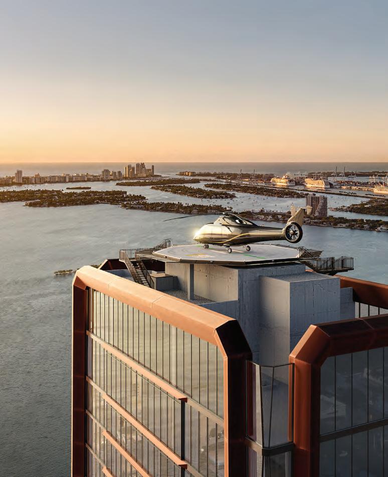 Rising 56 stories above Biscayne Bay at 710 NE 29th Street, the copper-clad tower offers just 70 half- and full-floor homes that channel estatestyle living in the sky. With an onsite private dock, rooftop helipad, and uninterrupted views of sea and skyline, every detail is sculpted for those who demand the exceptional.