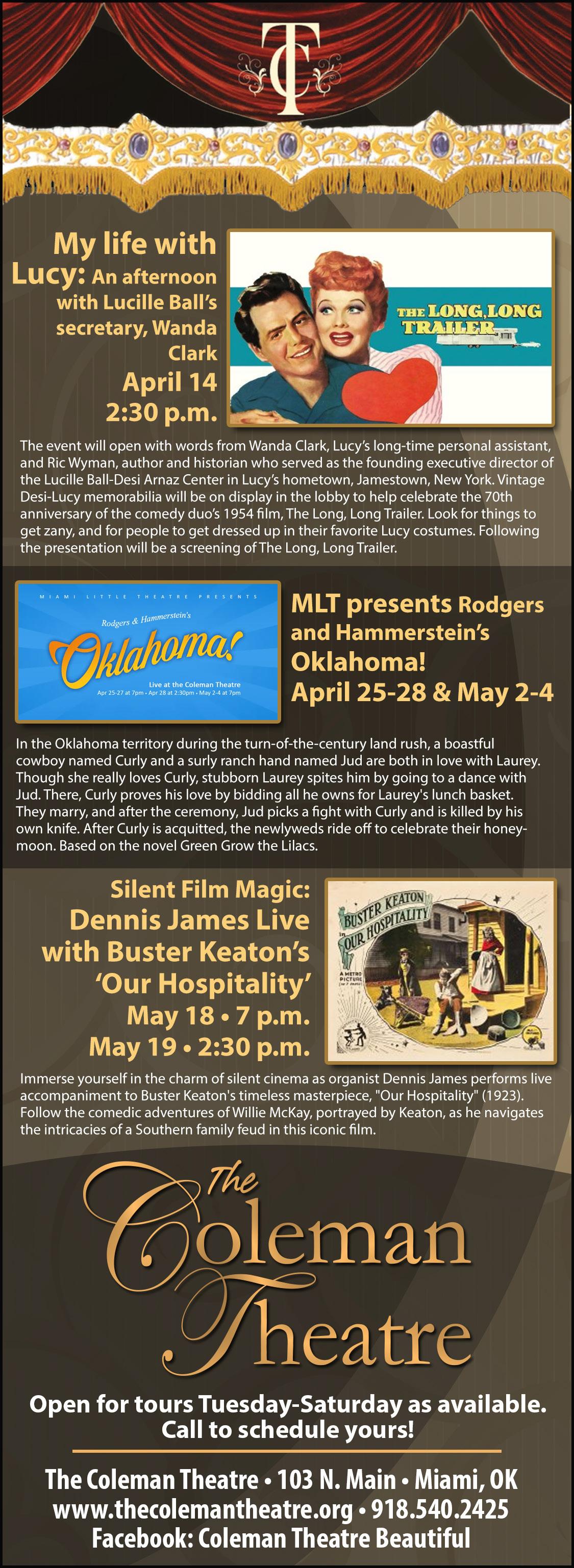 April 19: Joplin Improv Live Show, 8 p.m., Joplin Avenue Coffee Company, 506 S. Joplin Ave. Enjoy happy hour at 7 p.m. Then, stick around for a free improvised comedy show. More information: joplinimprov@ gmail.com