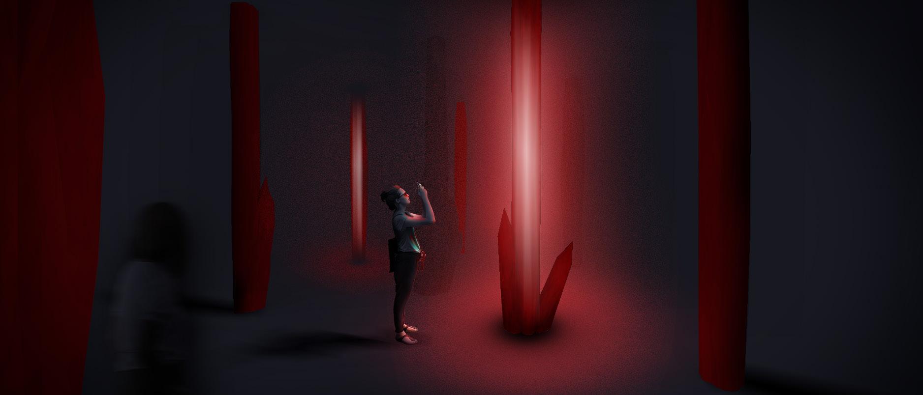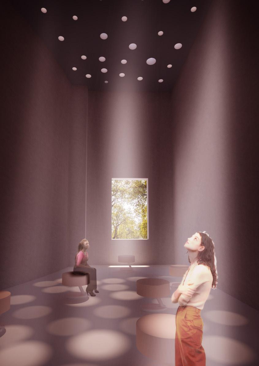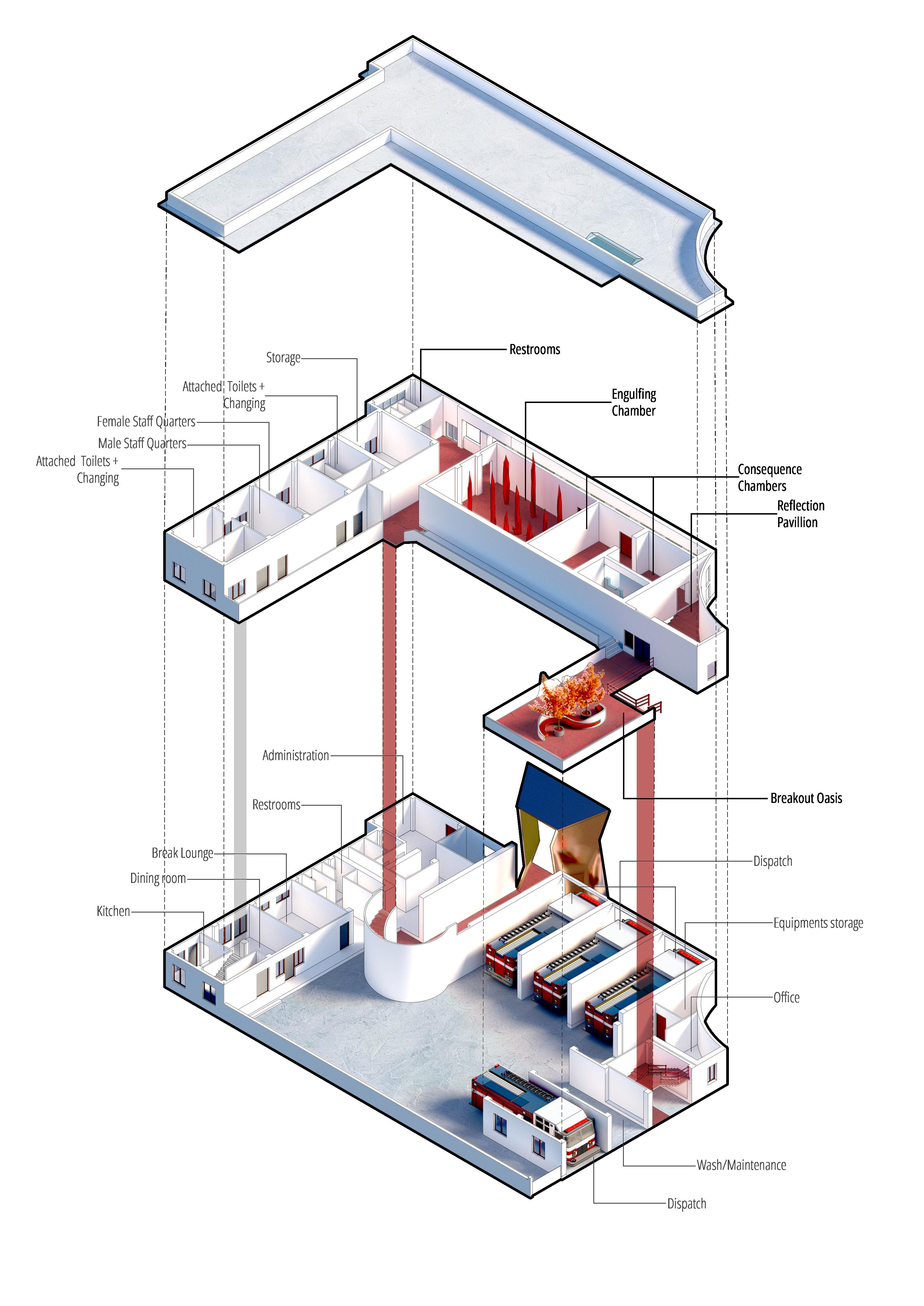 The museum’s design blends neoclassical elements with contemporary twists, symbolizing the unpredictability of fire. Visitors ascend a circular staircase past a sculptural representation of fire’s start, then enter the ENGULFING CHAMBER, filled with red crystals that glow when someone passes by, representing forest fires. Transitioning to the CONSEQUENCES CHAMBER, visitors encounter a warm, dry environment evoking post-fire landscapes. The REFLECTION PAVILLION offers a view of Bhugol Park, urging visitors to preserve green spaces. Finally, the BREAKOUT OASIS provides a tranquil space for reflection before exiting via a staircase resembling fire exits.