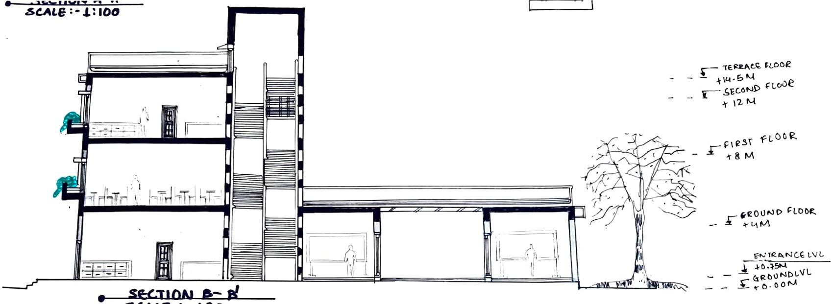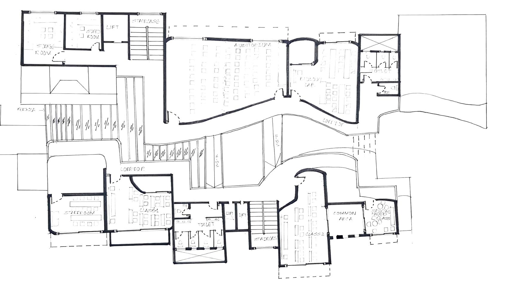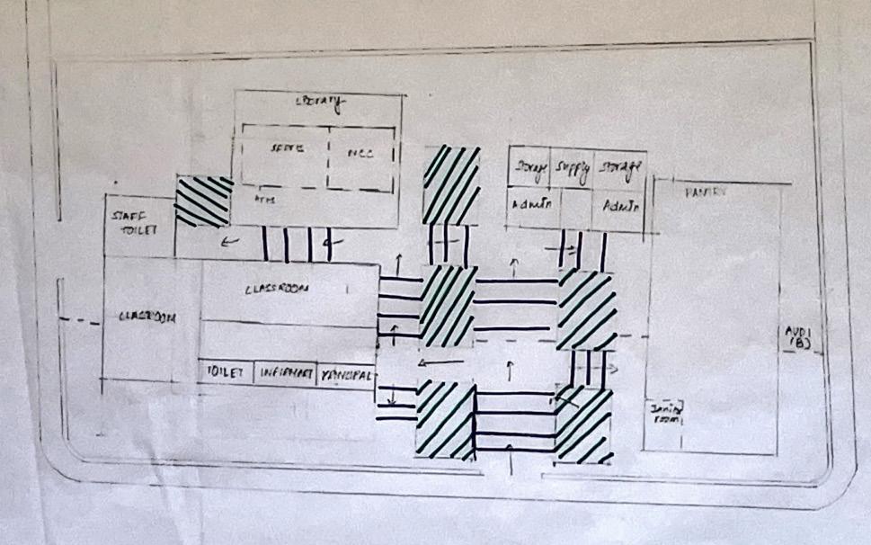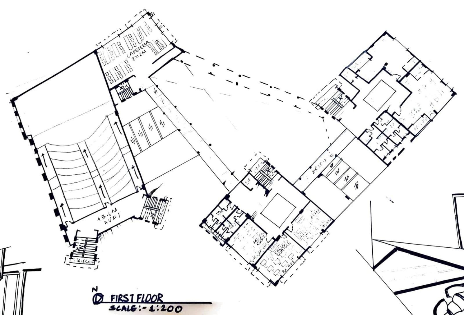 The spaces have been interconnected via transition spaces that too have been openend up for better light and ventilation to take place. The labs are connected to the admin and lounge via the bridges that give a parabolic view from the site. The blocks are placed at 45 degrees so that the services, the labs have a parabolic view from the site. one side of the staircase is made out of jalli bricks for light and shadow. PLAN SCALE:-1:100 N