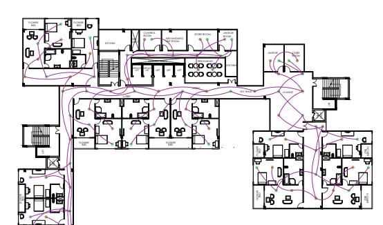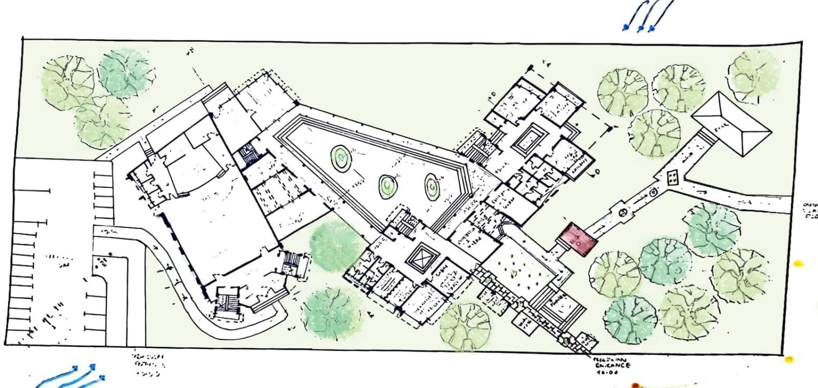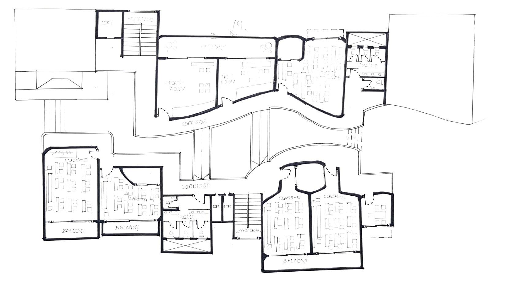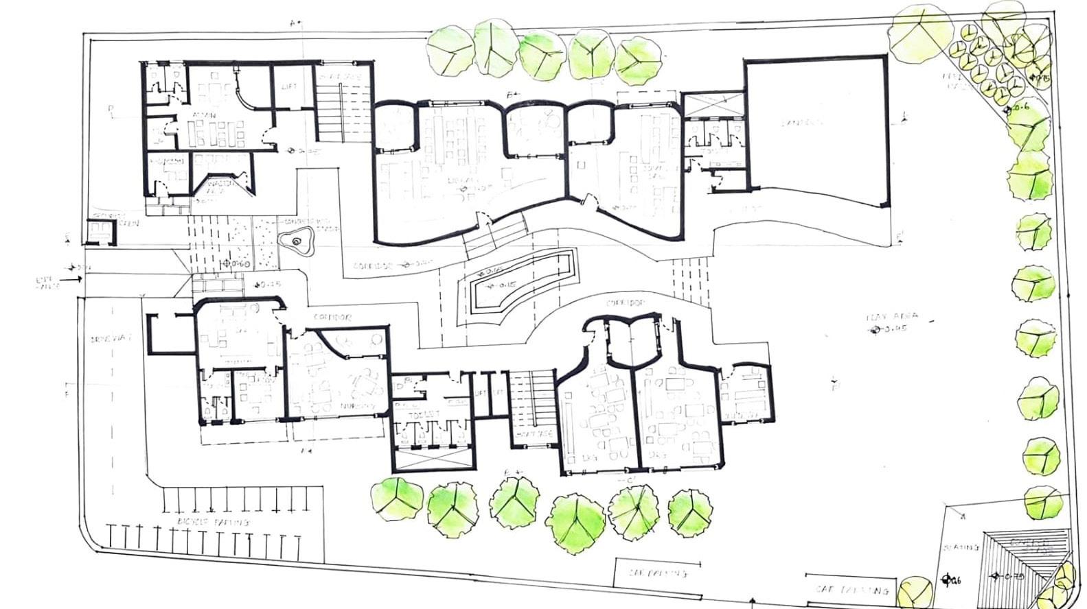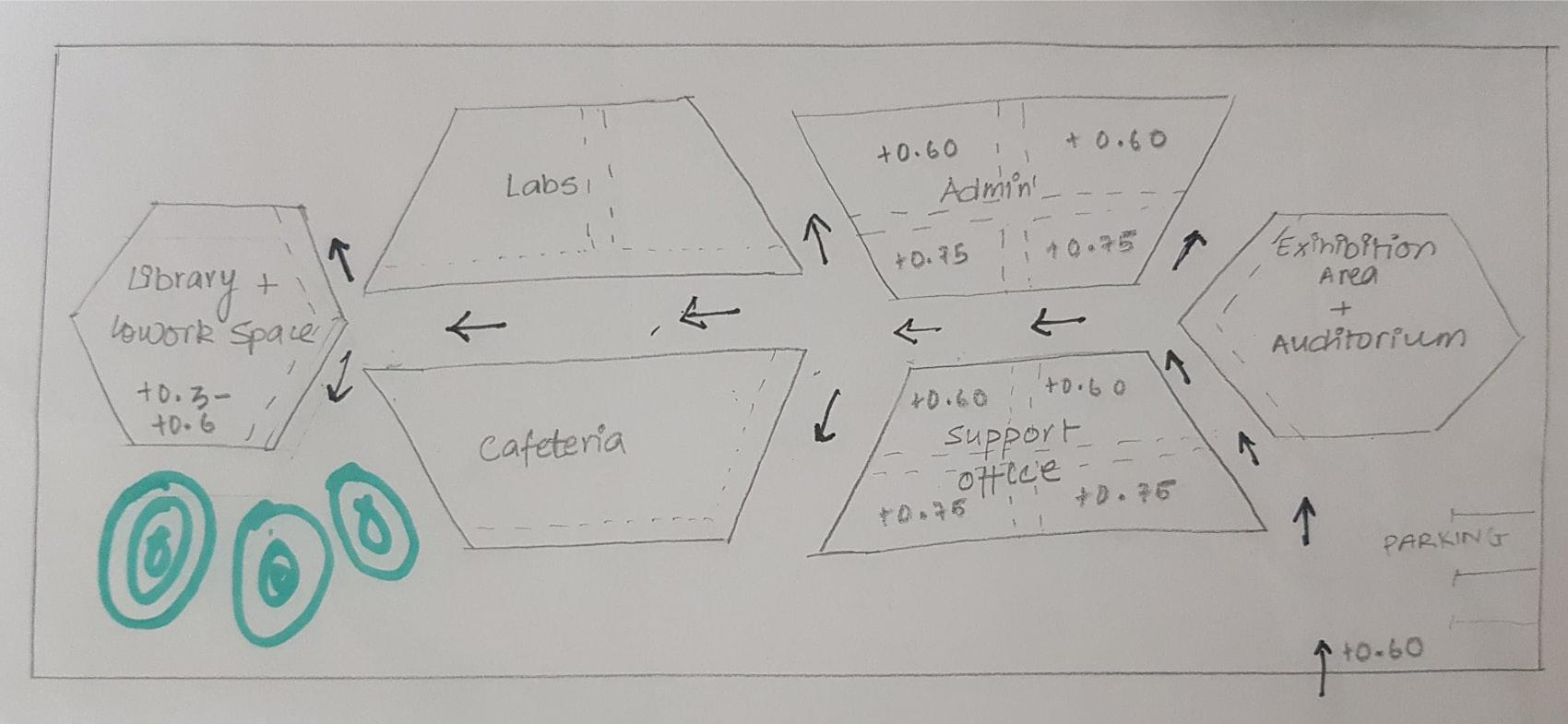 The spaces have been interconnected via transition spaces that too have been openend up for better light and ventilation to take place. The labs are connected to the admin and lounge via the bridges that give a parabolic view from the site. The blocks are placed at 45 degrees so that the services, the labs have a parabolic view from the site. one side of the staircase is made out of jalli bricks for light and shadow. PLAN SCALE:-1:100 N