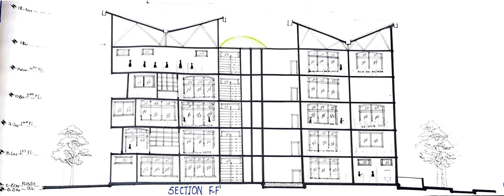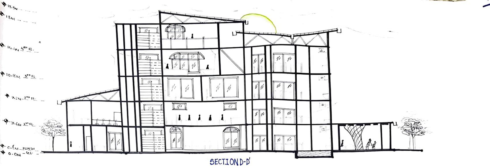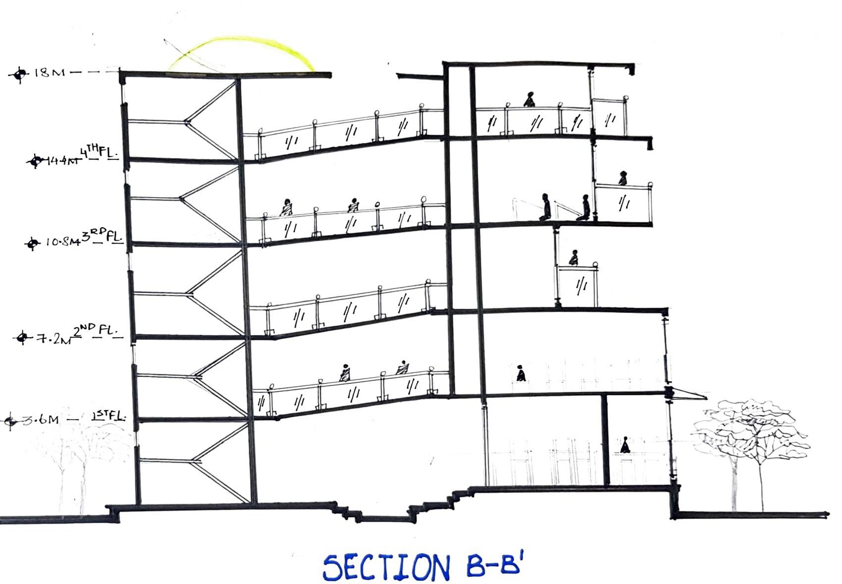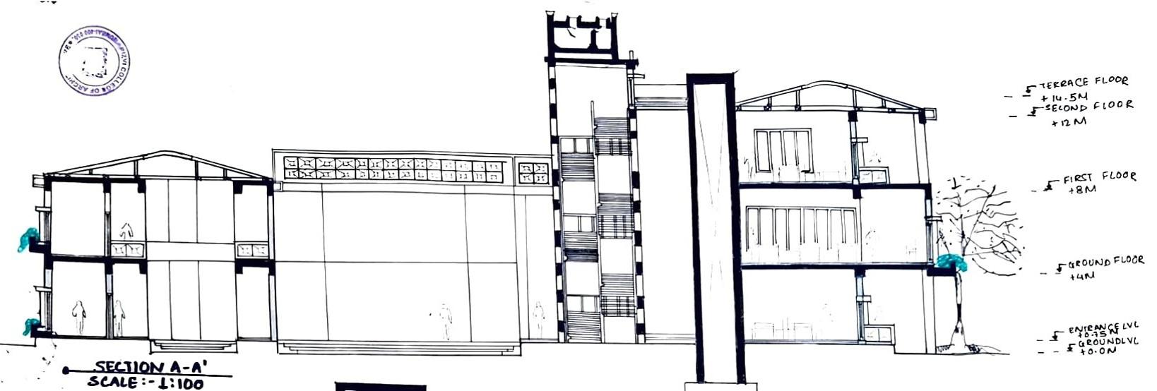 MUMTY ROOM LIFT SHAFT OHT STAIRCASE STAIRCASE STAIRCASE STAIRCASE STAIRCASE STAIRCASE STAIRCASE STAIRCASE D1 W3 W3 W3 W3 W3 W3 W3 W3 W3 SECTION A-A' LOBBY LOBBY LOBBY LOBBY LOBBY LOBBY LOBBY LOBBY LOBBY LOBBY LOBBY LOBBY LOBBY LOBBY COLLEGE NAMERIZVI COLLEGE OF ARCHITECTURE YEAR & SEM-2023,SEM6 EXAM SEAT No. ROLL No.-2019 NAME- SHRAVYA JHAWAR DWG No. & SCALE-50 COLLEGE STAMP & SIGN. SECTIONS LEGEND NOTES 1. THIS IS AN ACADEMIC EXERCISE. 2. DRAWINGS SHOULD NOT BE MEASURED. 3. DATA'S ARE ASSUMED WHEREVER REQUIRED. 4. R.C.C FRAMED STRUCTURE. 5. REFER SEPARATE NOTES FOR MINIMUM DEPTH,THICKNESS,PROJECT SPECIFICATIONS FOR STRUCTURAL MEMBERS. 6. WALLS ARE AND 230 AND 150 MM. THK. RESPECTIVELY. 7. BRICKS TO BE LAID WITH FROGS UPWARDS. 8. MORTARS SHOULD NOT EXCEED 18 MM IN THICKNESS. 9. FIRST COAT TO BE MADE WITH WATER PROOFING ADMIXTURES. 10.DRIP MOULD TO BE PROVIDED TO ANY PROJECTIONS. 11.PLASTER THICKNESS 12 MM INTERNALLY AND 18 MM EXTERNALLY. 12.ALL DIMENSIONS ARE FROM UNFINISHED TO UNFINISHED FACE. 13.LEVELS ARE MENTION WITH REFERENCE TO THE GROUND FLOOR LEVEL. 14.ARCHITECTURAL PROJECTIONS SUCH AS CHAJJA,CANOPIES TO BE SHOWN IN DOTTED LINE, EXCEPTION FOR CASE SPECIFIC. 15.VOIDS TO BE MARKED WITH DIAGONAL LINES. 16.DRAWINGS TO BE CHECKED THOROUGHLY BY THE SITE ENGINEER BEFORE THE EXECUTION OF WORK. 17.ANY AMBIGUITY TO BE CLARIFIED BY THE ARCHITECT WITH IMMEDIATE EFFECT IN WRITING.